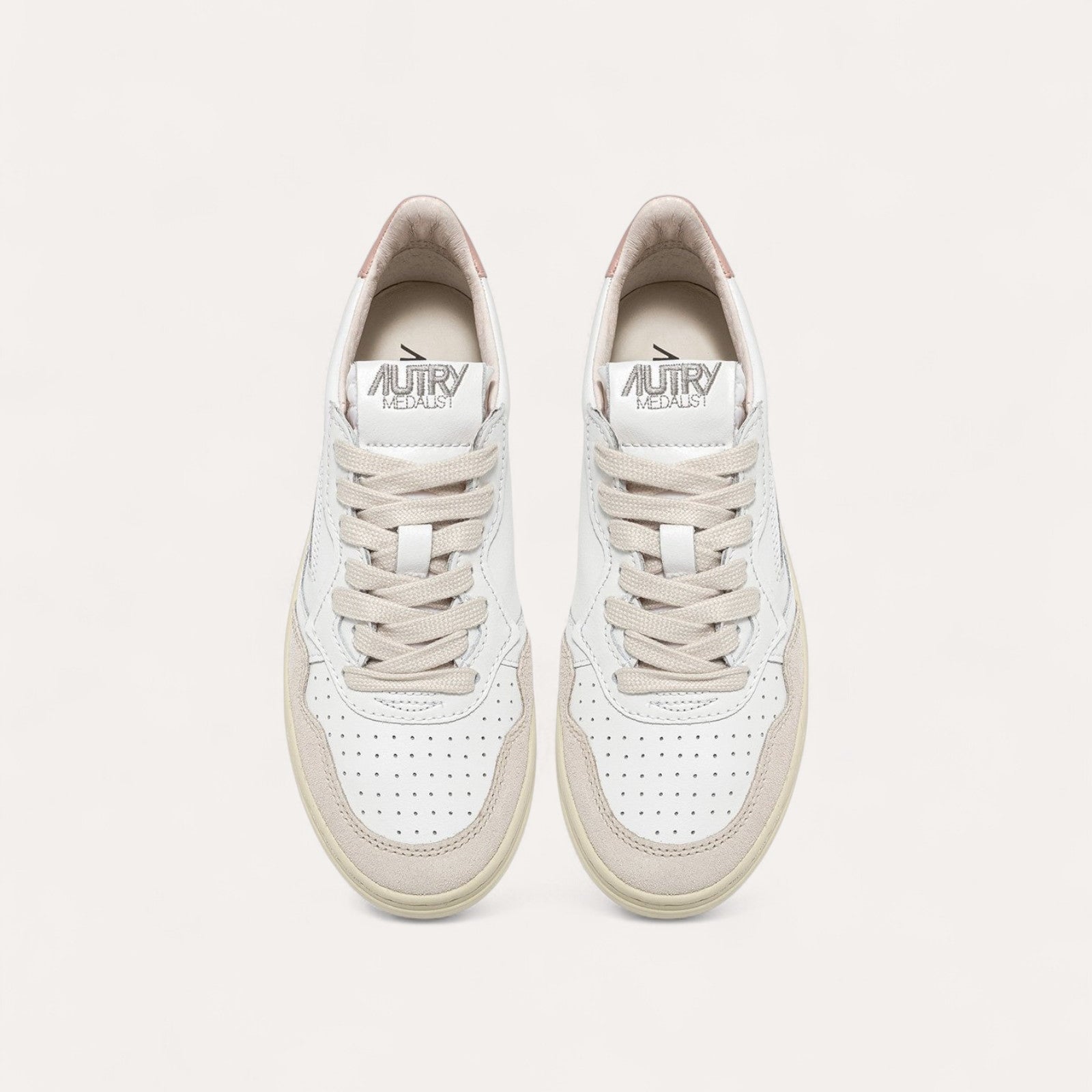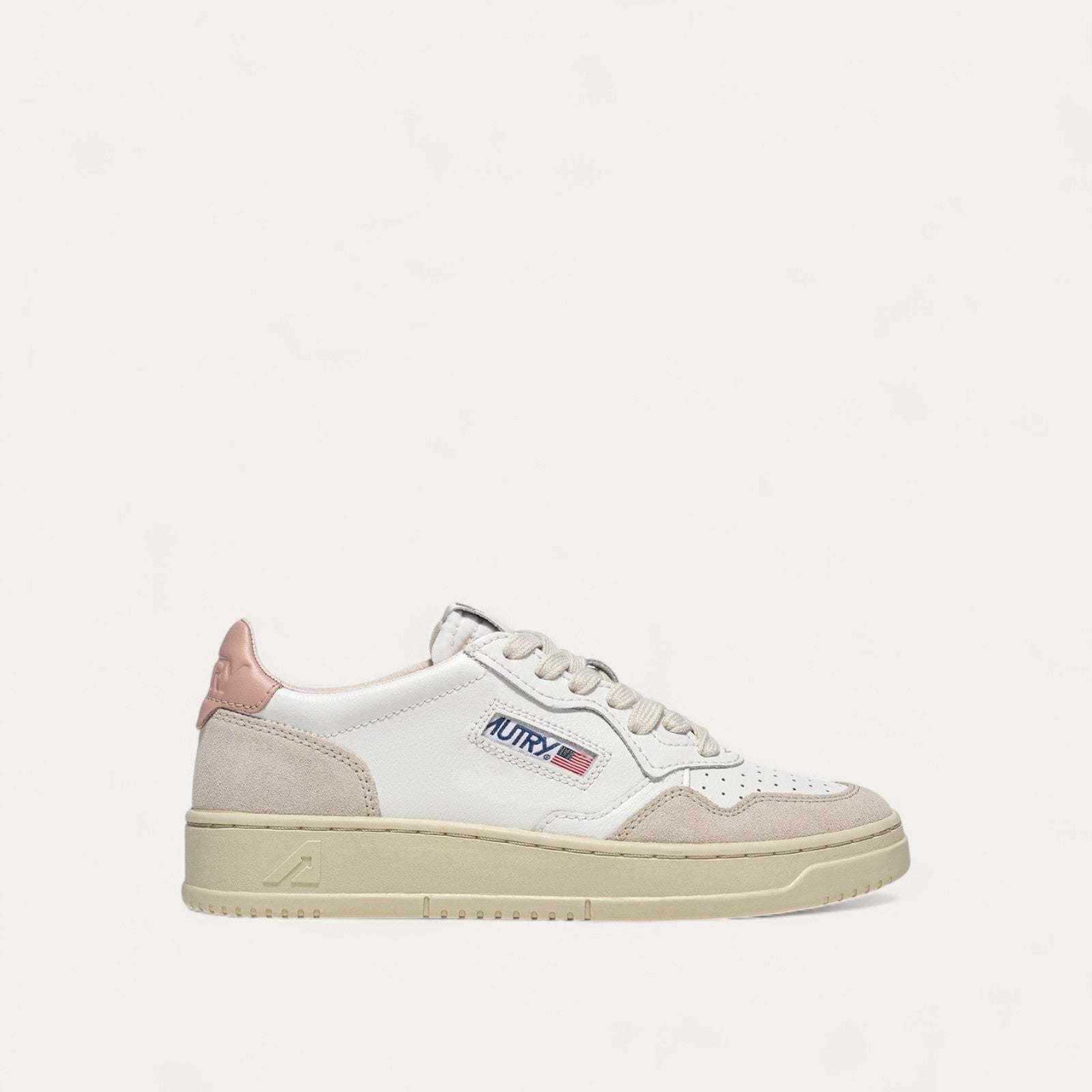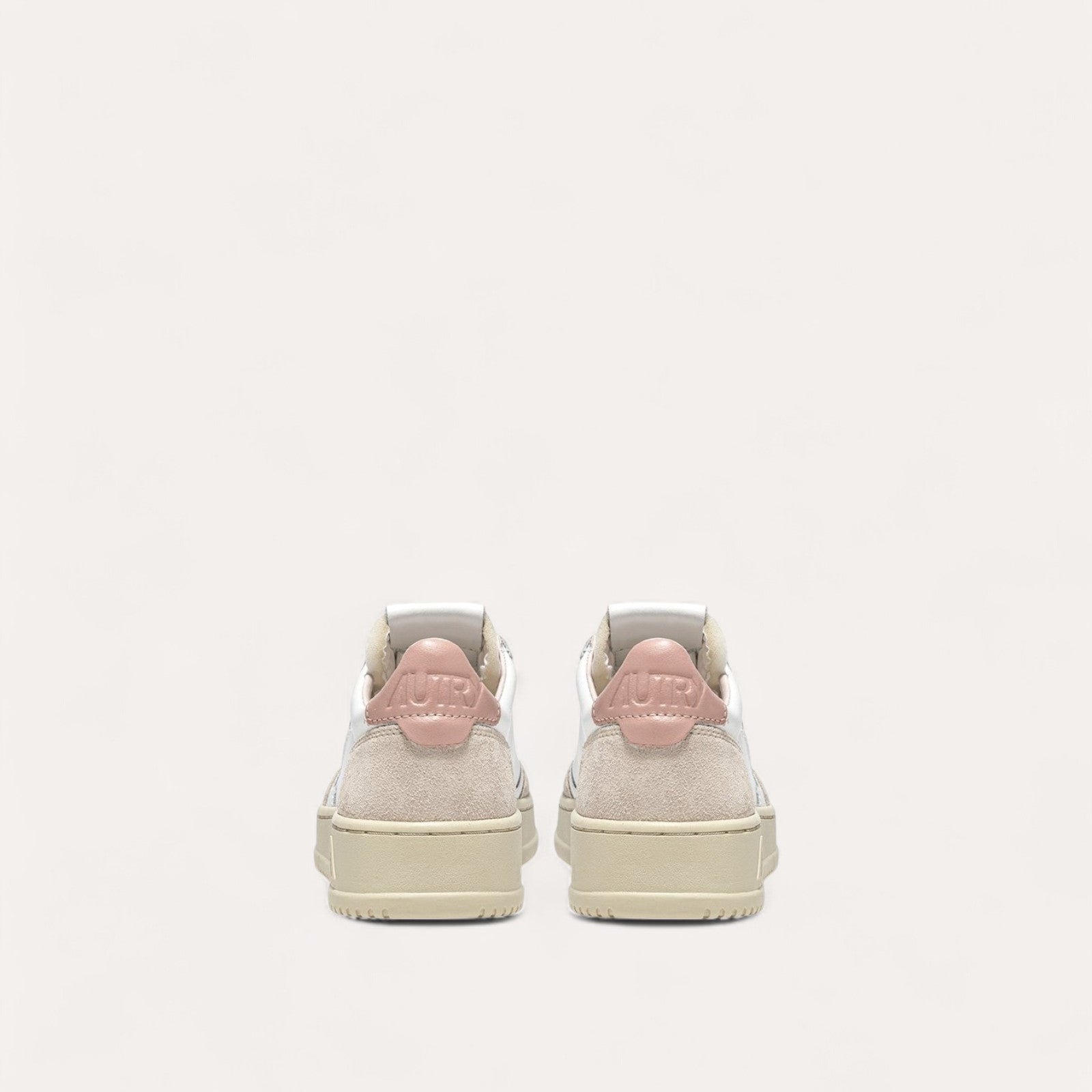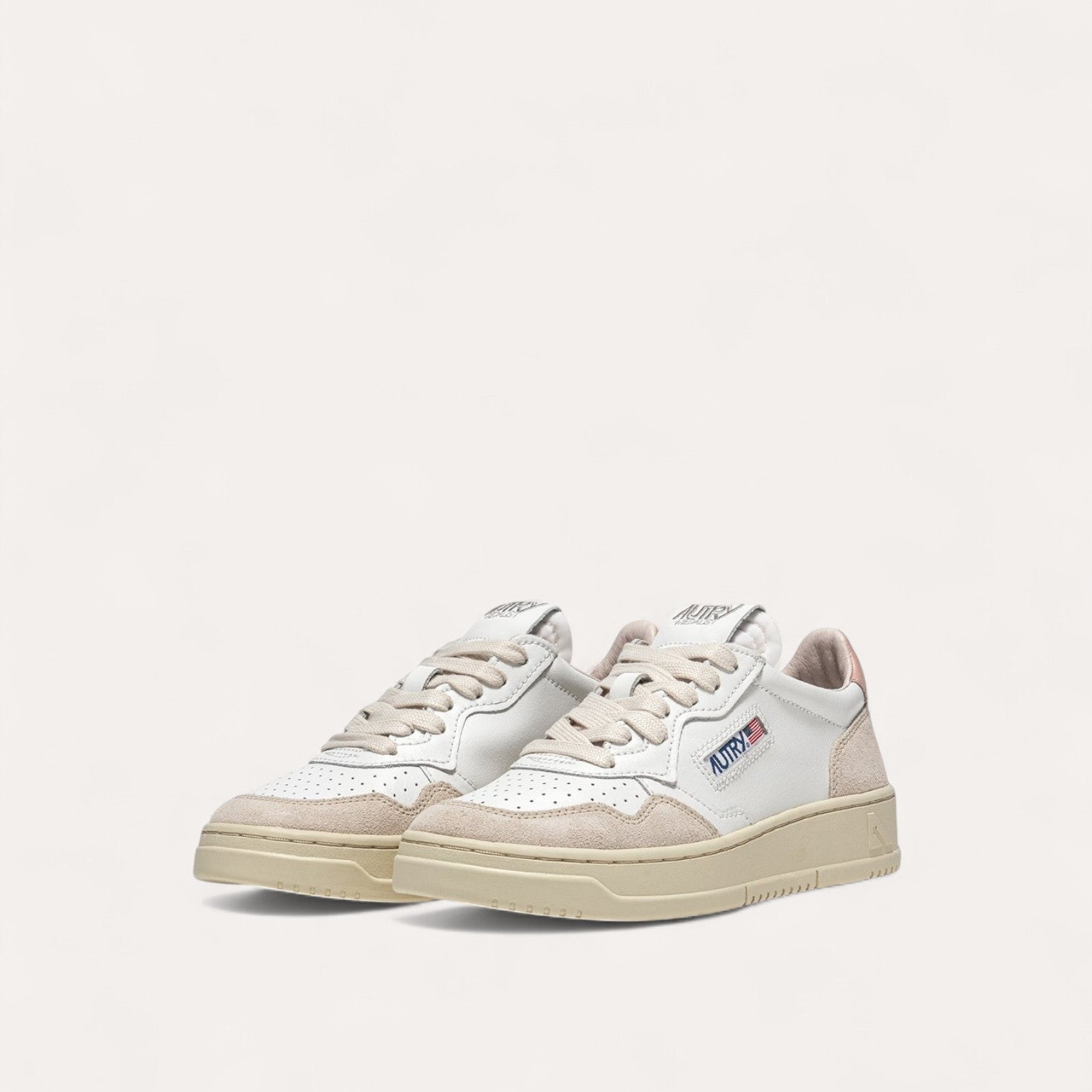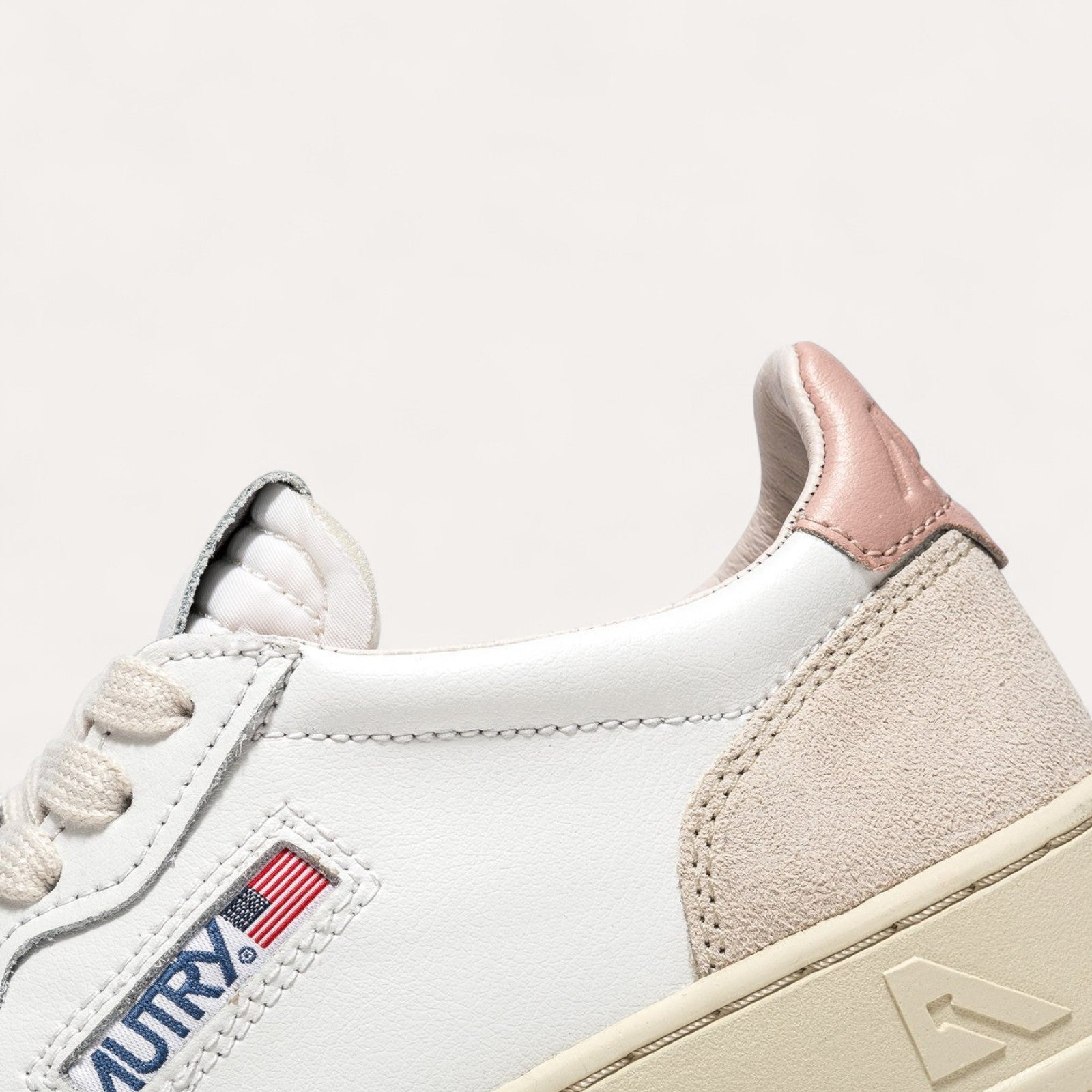 Baskets basses pour femme, réalisées en cuir souple blanc d’aspect authentique, rehaussées de renforts en daim beige et d'un détail en cuir rose sur le talon.