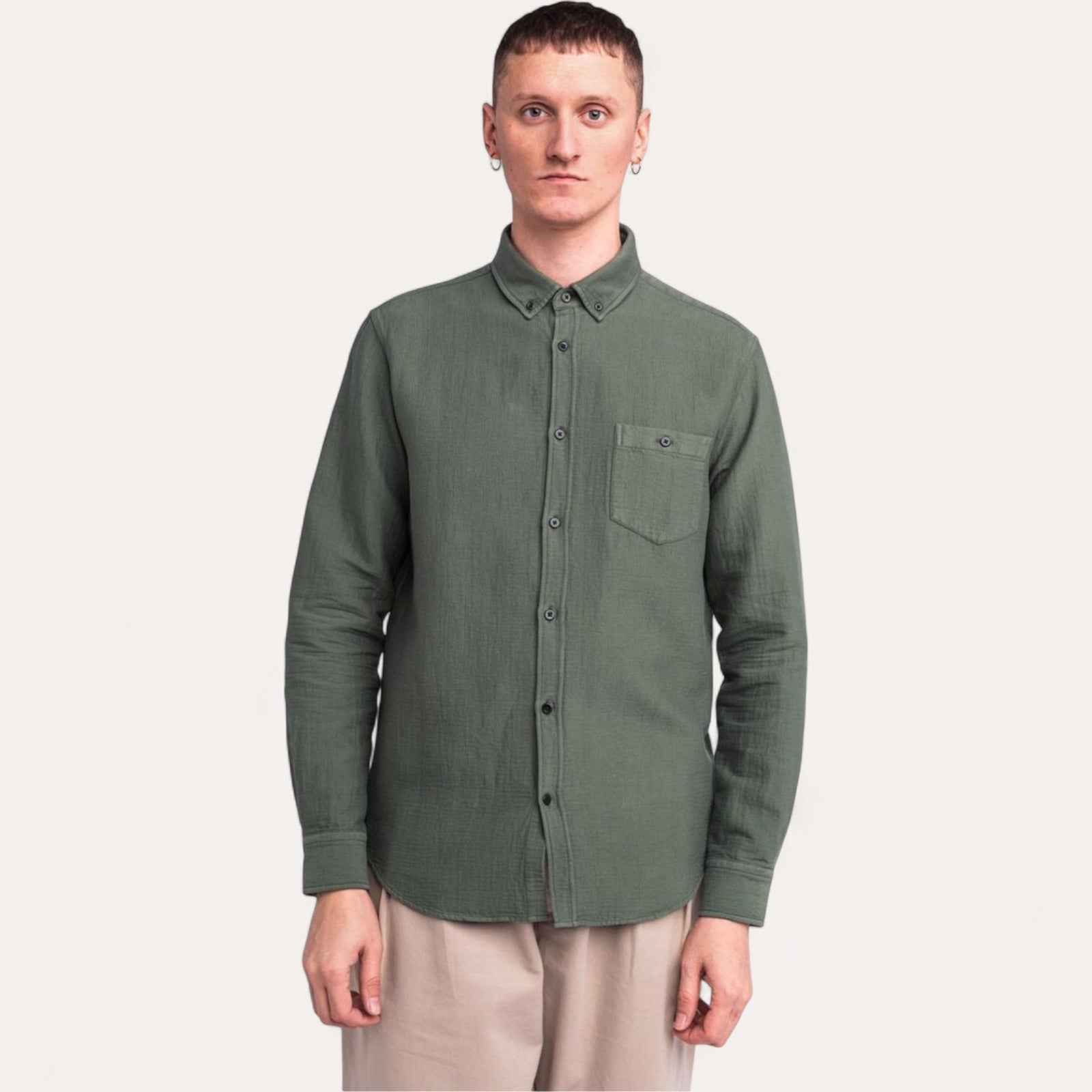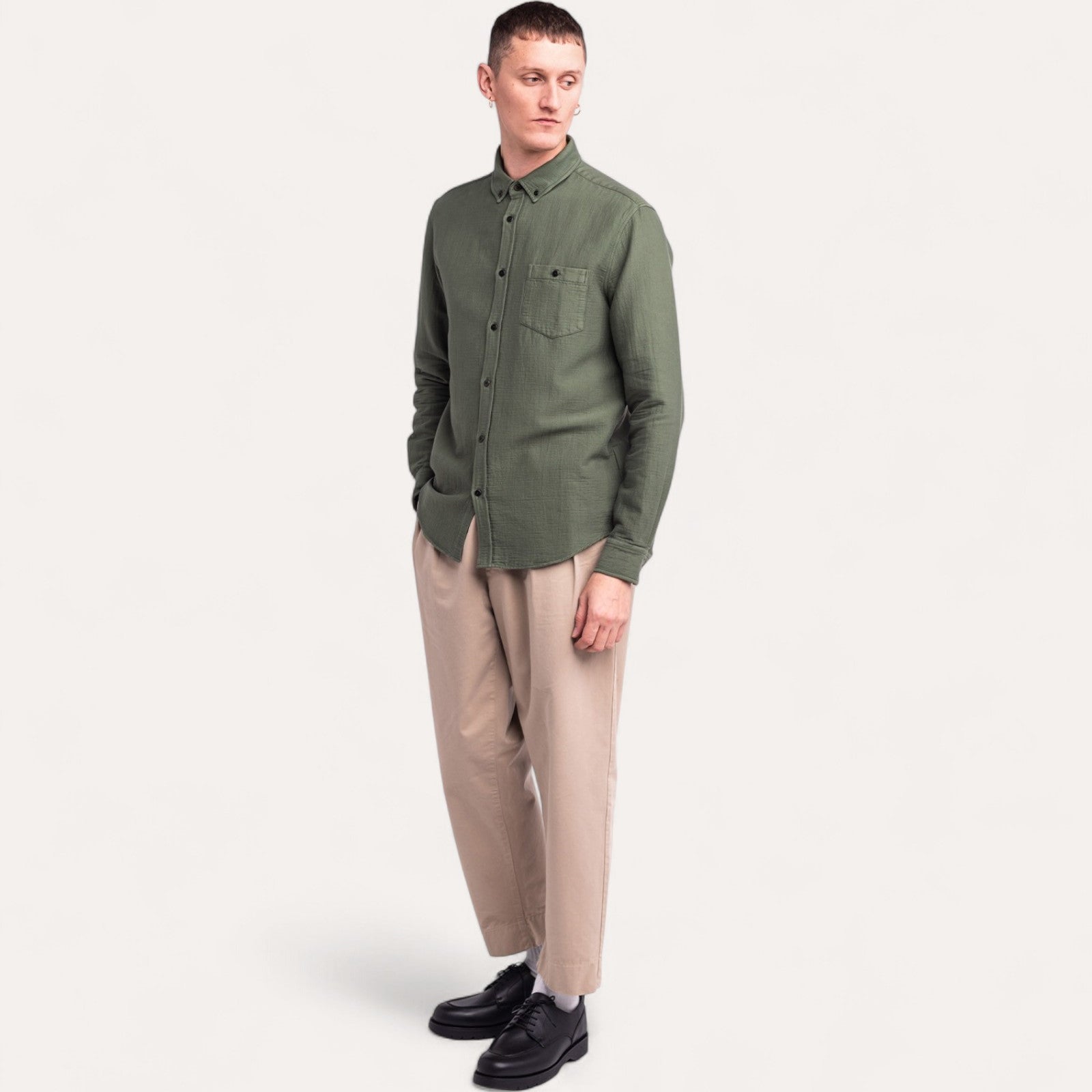 Tissage Français : Son coton texturé est fier d'être tissé en France. Cette technique confère un relief subtil à la matière, enrichissant la teinte Marsh Kaki.