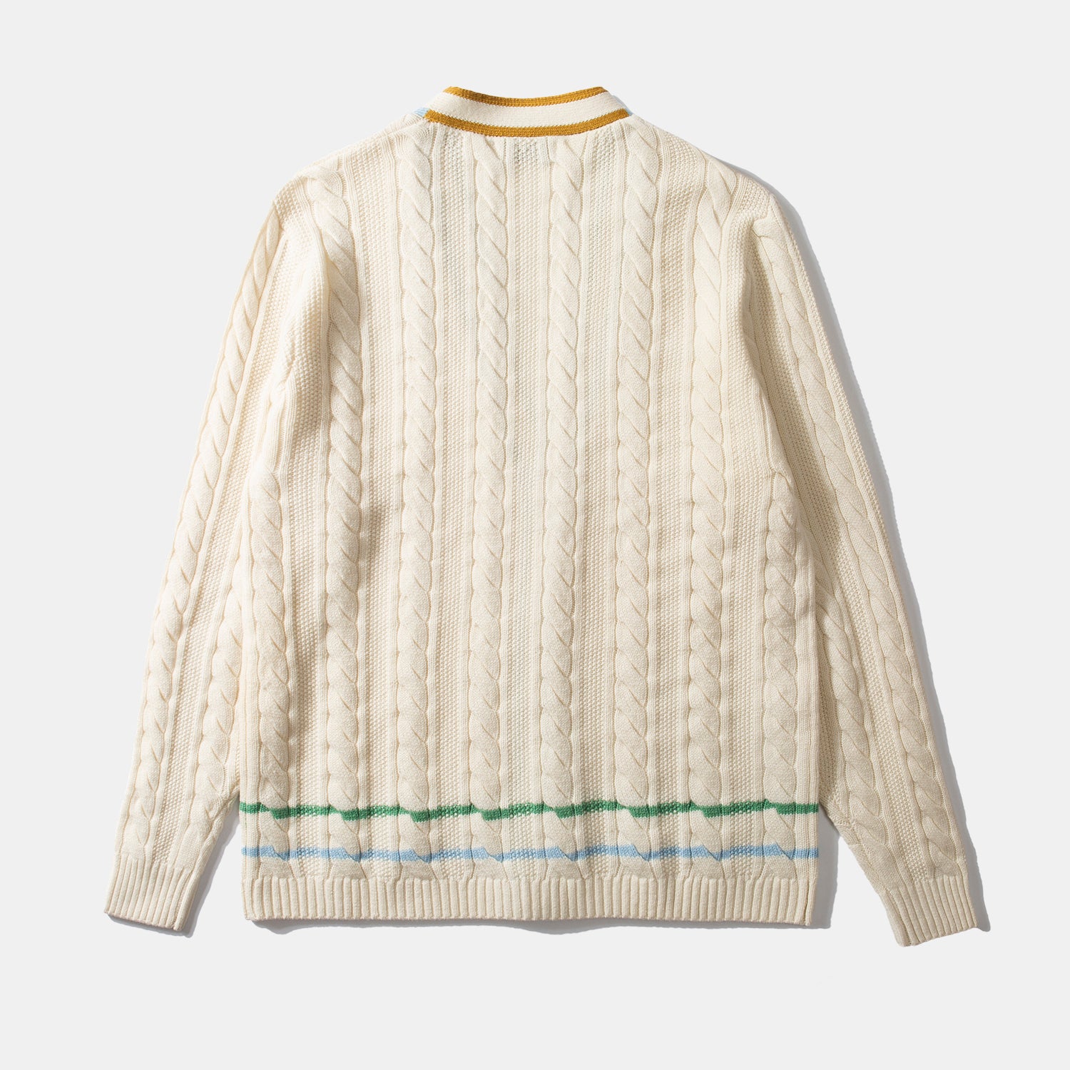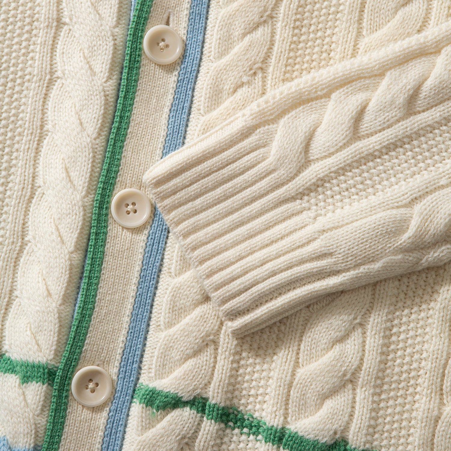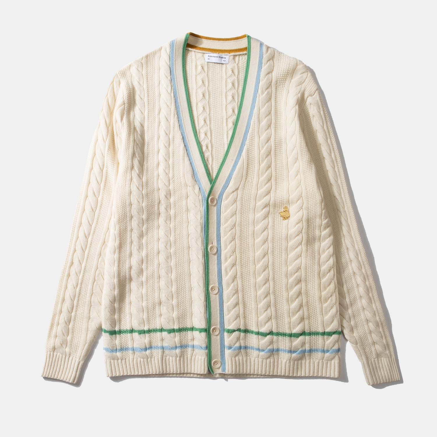 Cardigan en cachemire avec pin's canard. Col en V, bords-cotes. Maille de qualité supérieur.