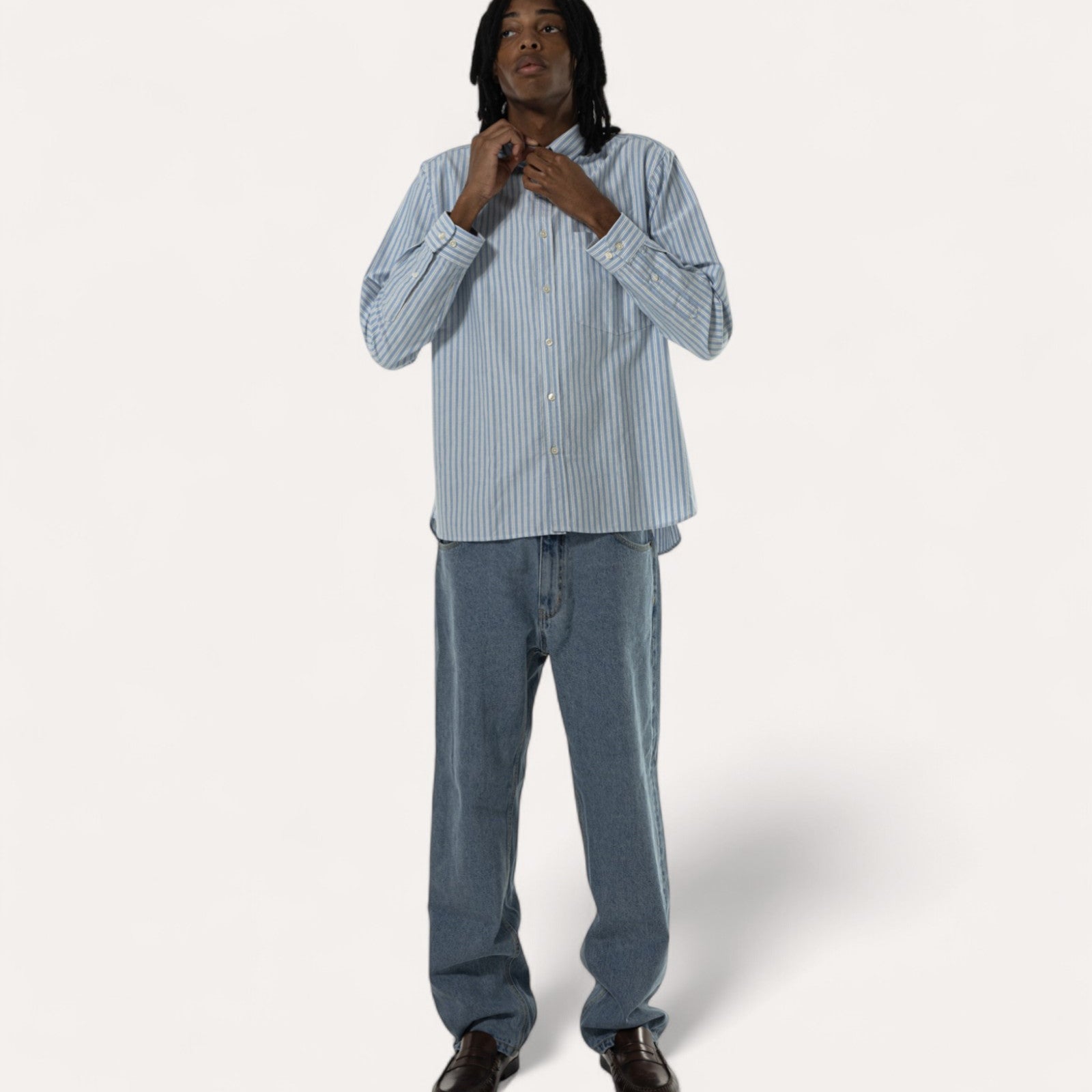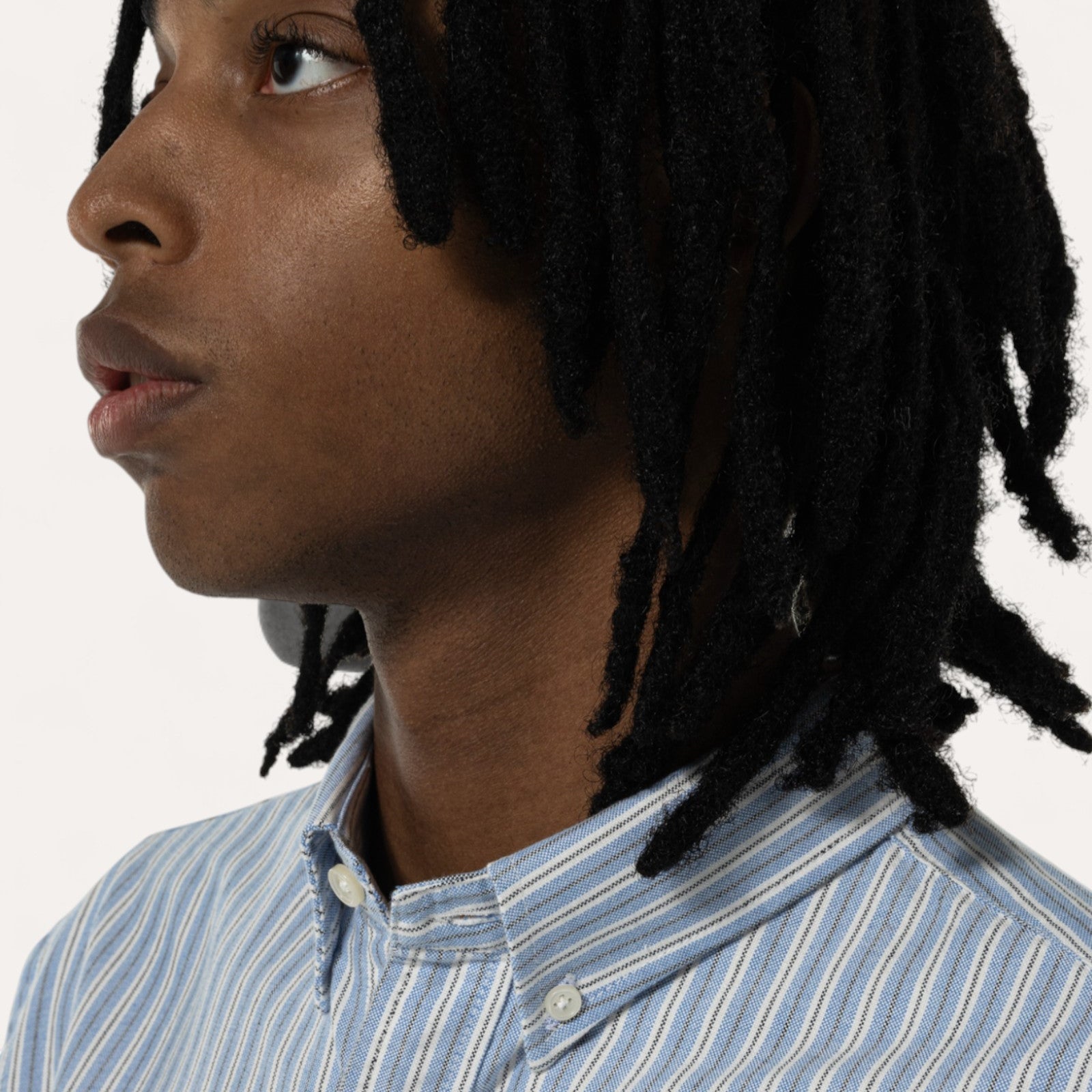 Confectionnée en 100 % coton de haute qualité, elle offre une sensation de légèreté et un confort idéal pour toutes les occasions. Le motif à fines rayures verticales bleues et blanches apporte une touche d'élégance classique, parfaite pour un look soigné et décontracté.