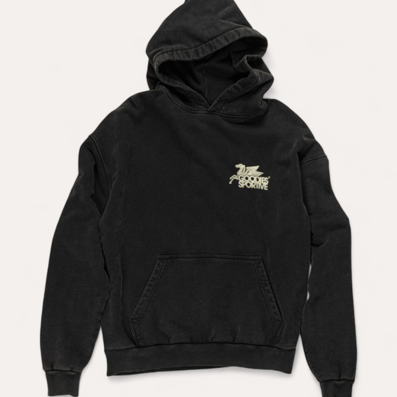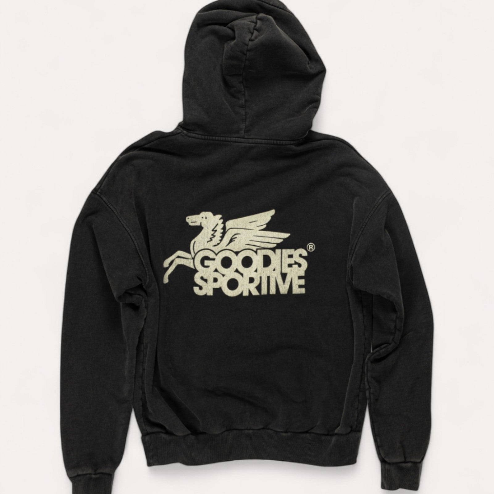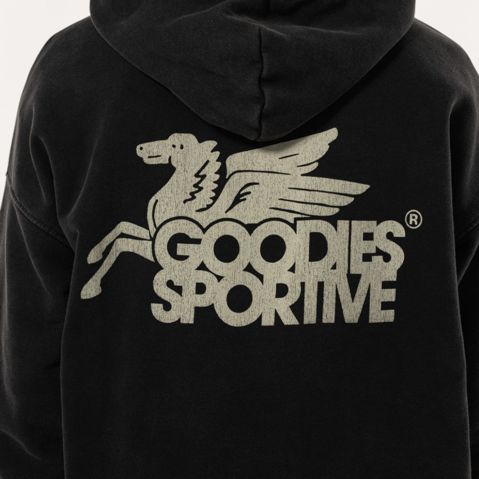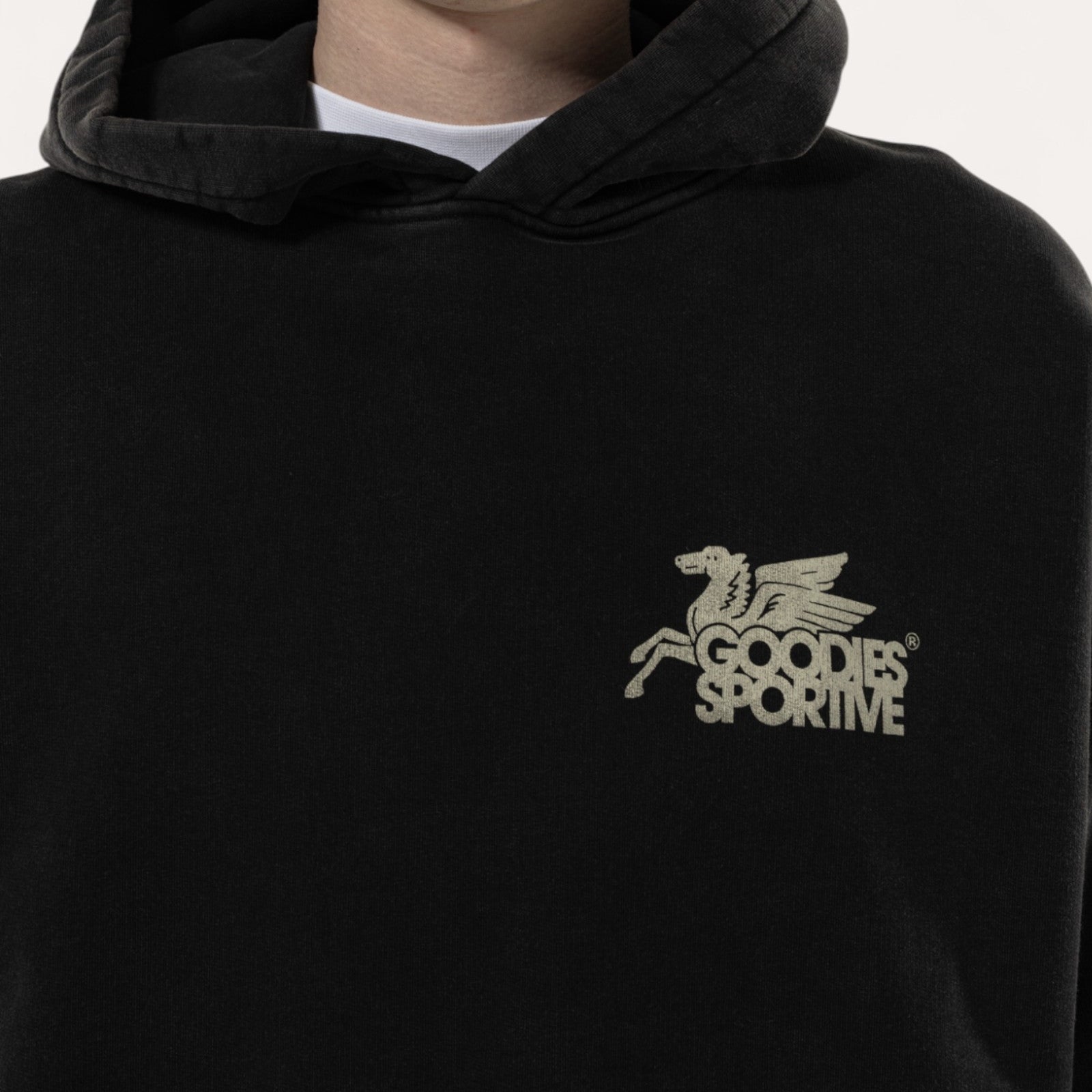 Devant : Un petit logo effet vintage sur la poitrine, représentant un cheval ailé et l'inscription "GOODIES SPORTIVE".