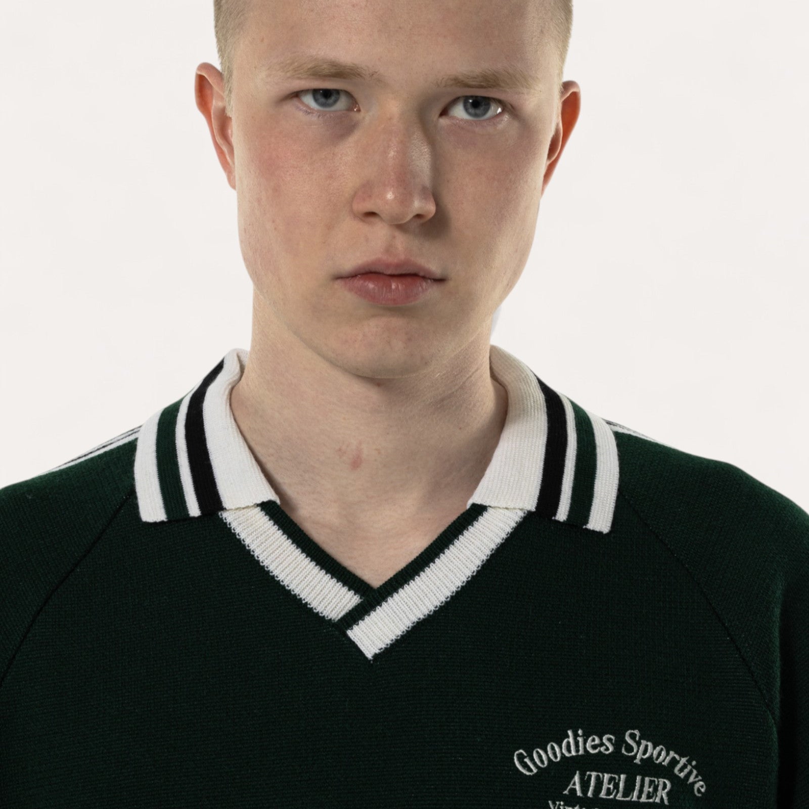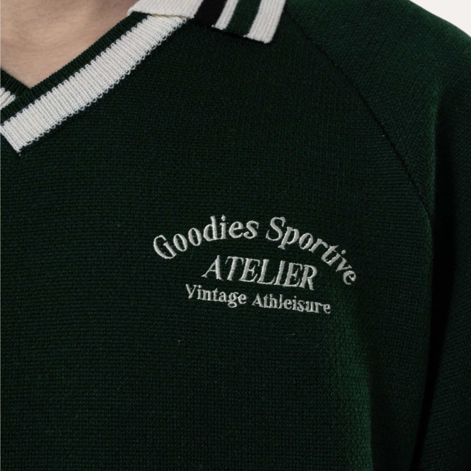 Sur la poitrine, un petit logo brodé en blanc indique "Goodies Sportive ATELIER Vintage Athleisure", faisant écho à l'esthétique rétro de la marque.