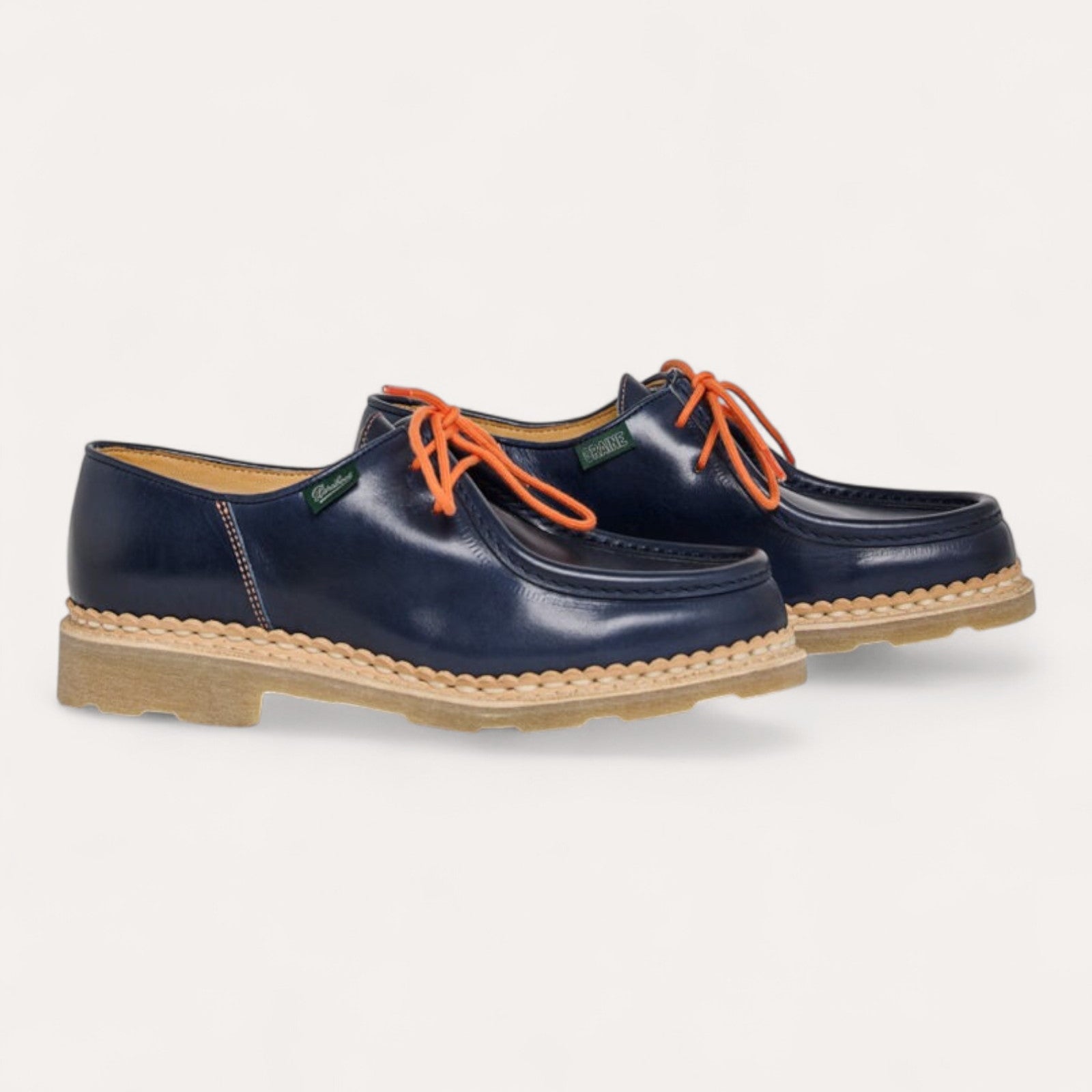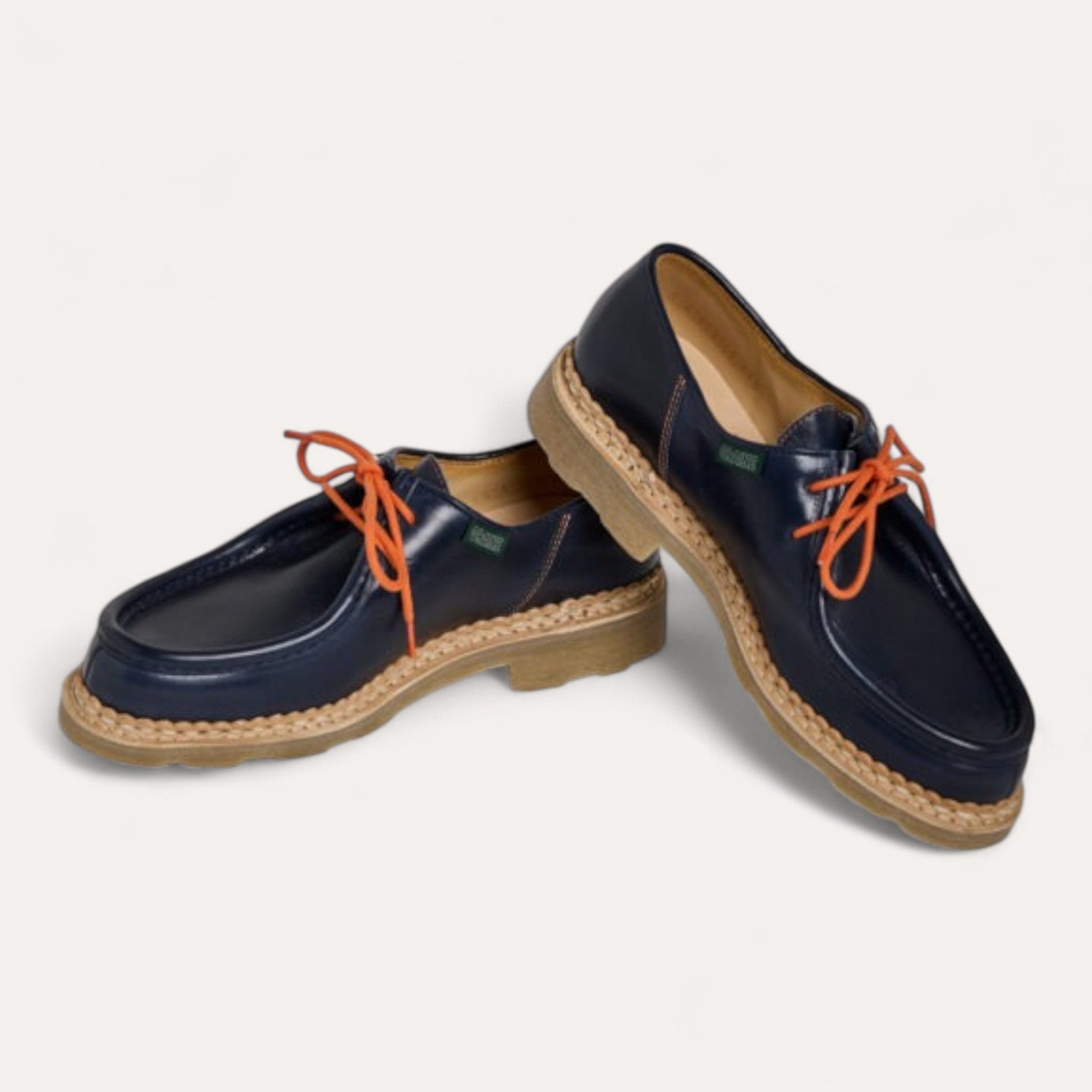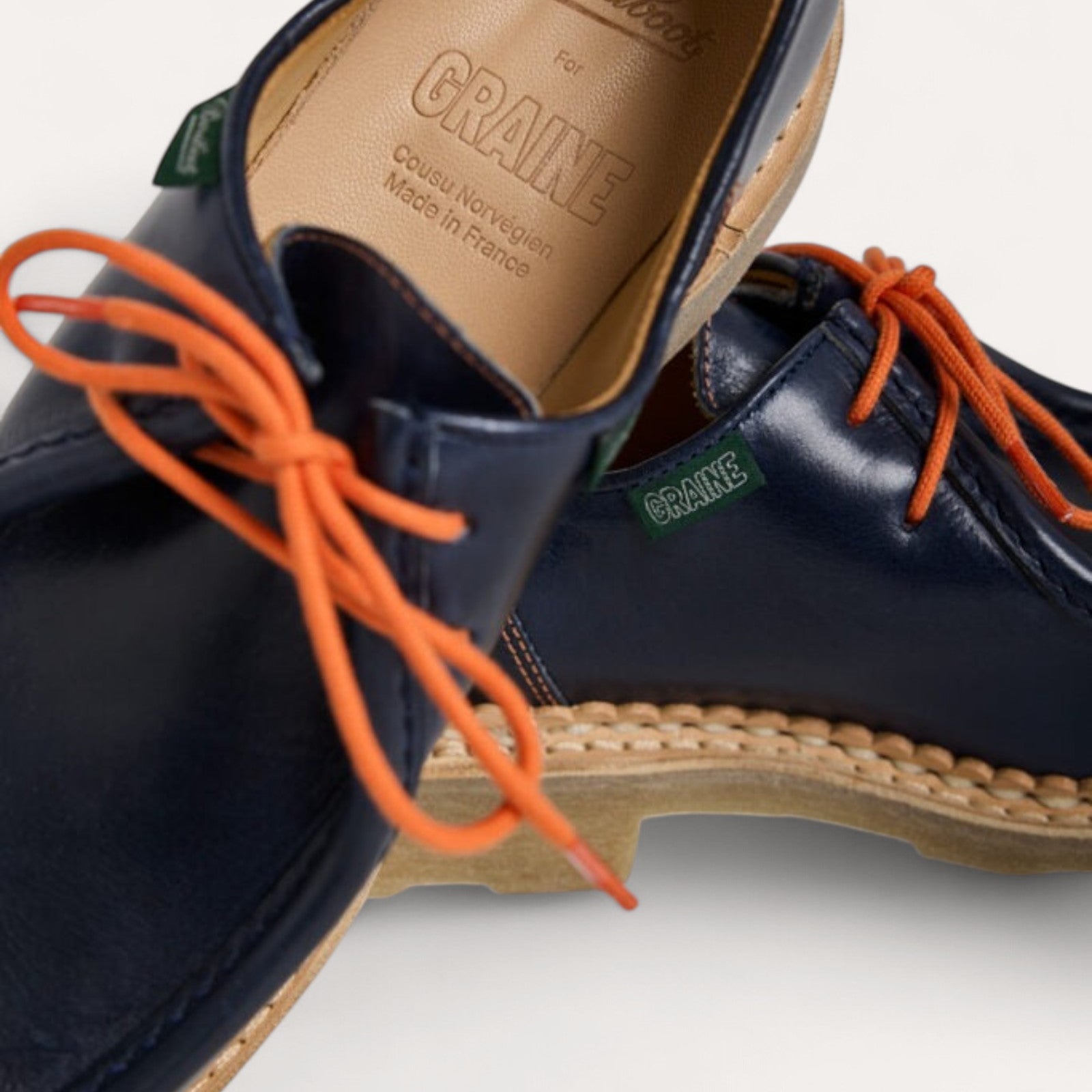 Chaussures Derby artisanales, cuir de veau en tannage végétal en provenance d’Italie, doublure en chèvre, tannage au chrome. Lacets en coton bio recyclé, trépointe en cuir végétal et semelle à base de caoutchouc naturelle. Fabrication France. Collaboration Graine X Paraboot. Couleur bleu navy. Lacets oranges.