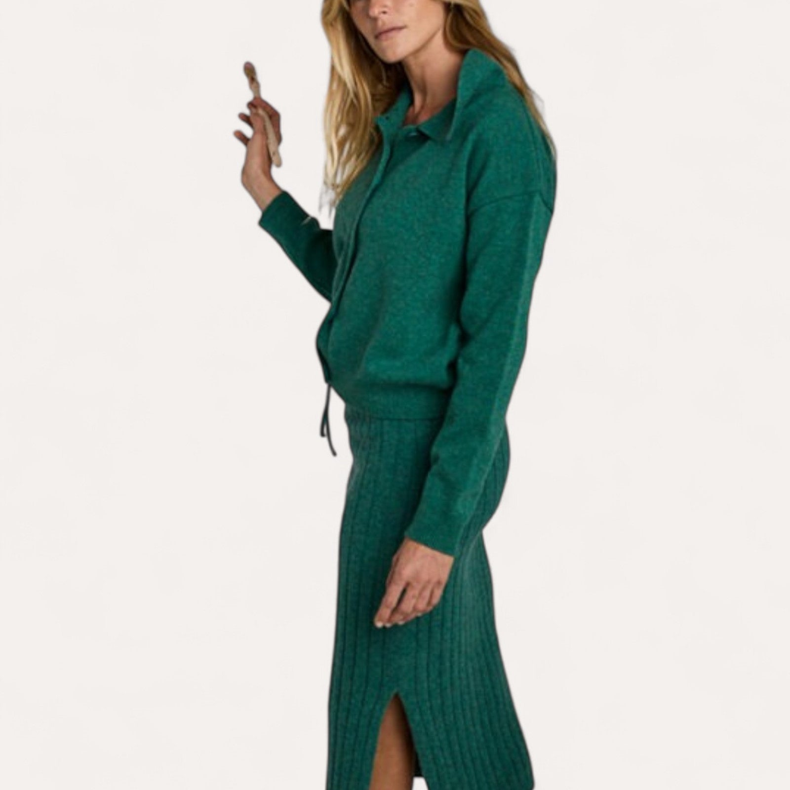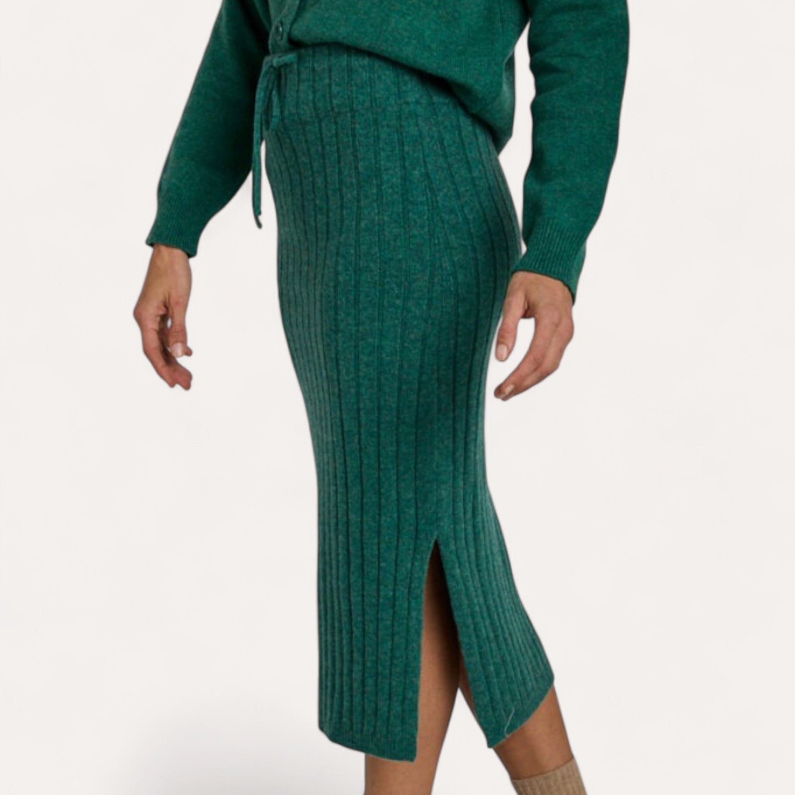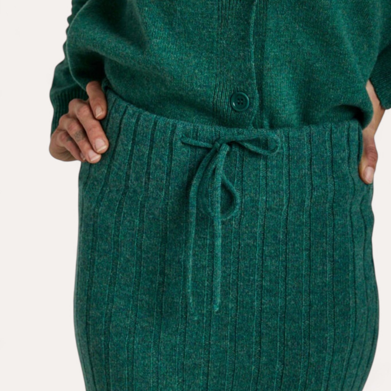 Jupe Graine 45% laine, 35% laine recyclée, 20% polyester recyclé certifié Global Recycled Standard / Fil, filature, tissage et teinture Italie couleur vert sapin, effet chiné 2 fils.