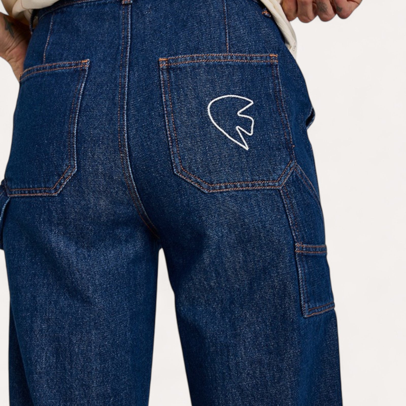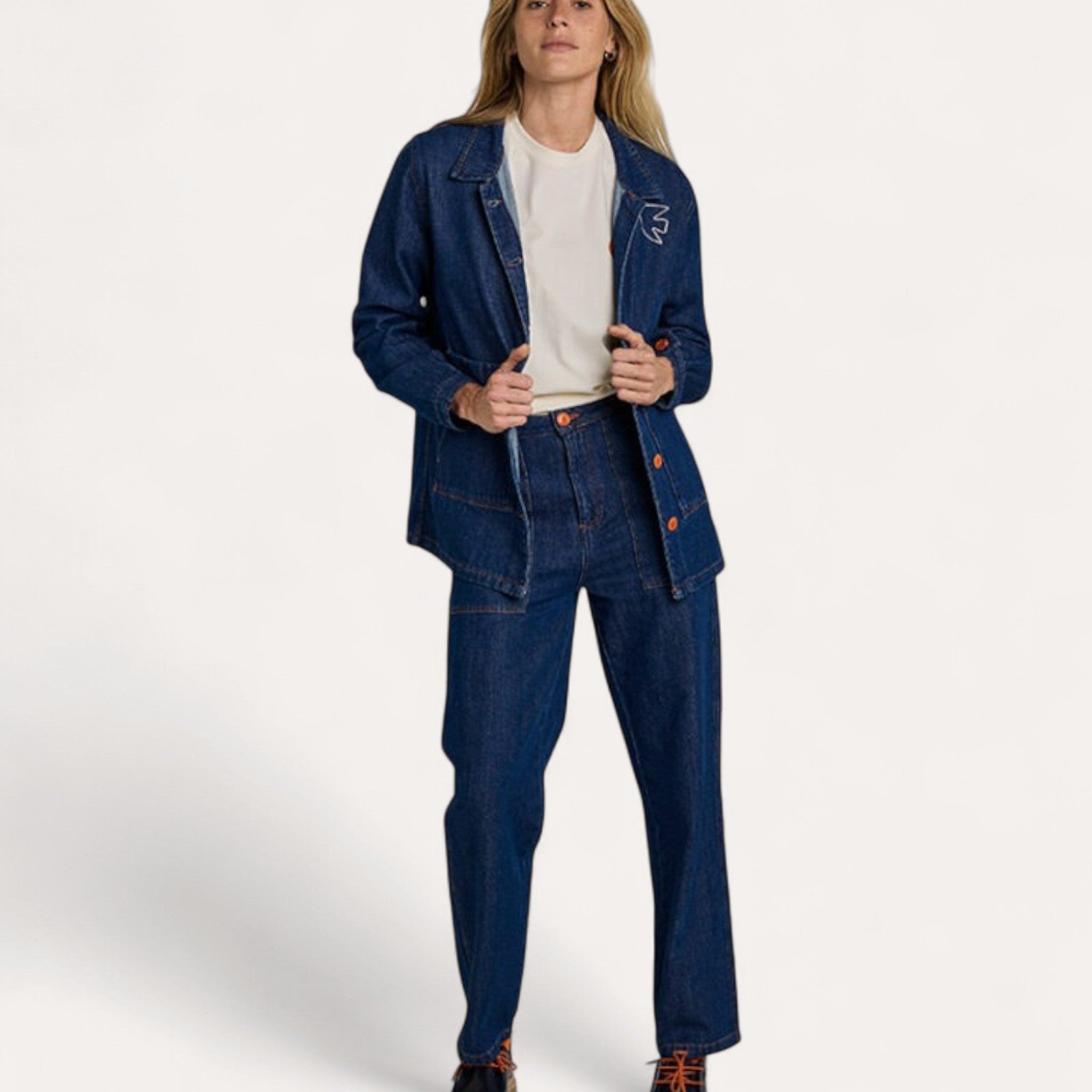 Couleur bleu denim. Surpiqûres orange. Deux poches plaquées devant et dos. Zip YKK et boutons en corozo. Broderie blanche sur poche arrière droite.