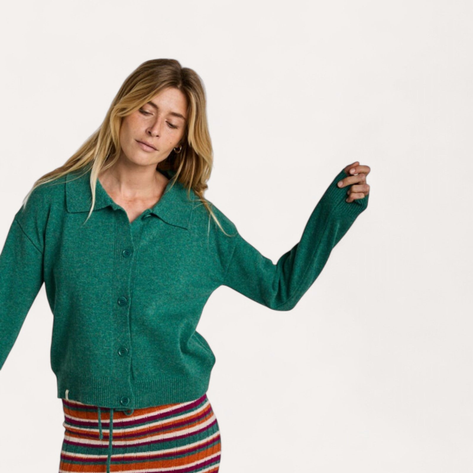 Gilet Graine 45% laine, 35% laine recyclée, 20% polyester recyclé certifié Global Recycled Standard.