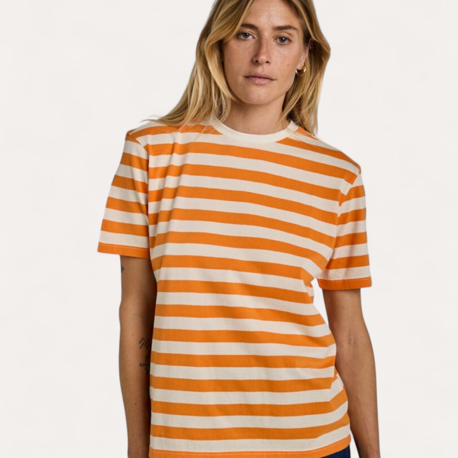 Tee-shirt jersey Graine 100% coton organique avec son fil d’origine certifié GOTS. Provenance matière Turquie. Couleur rayures orange et vanille.
