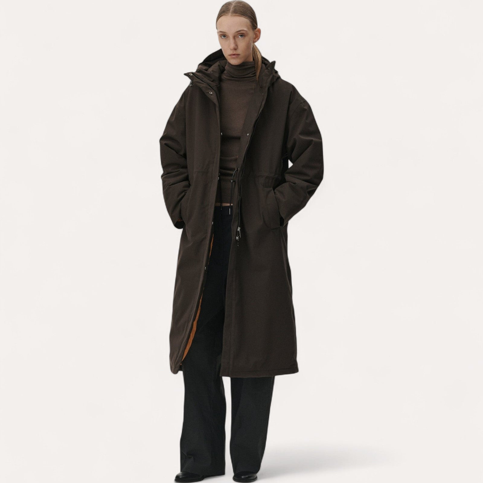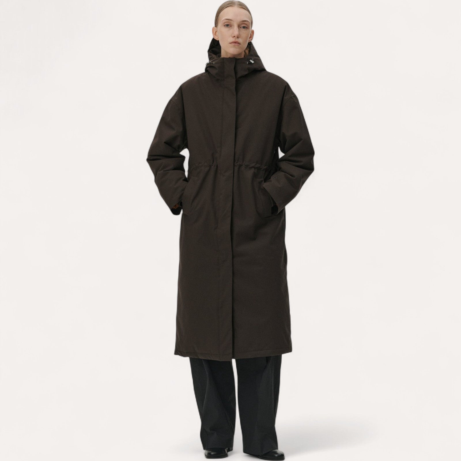 Ce manteau à capuche de Welter Shelter est la fusion parfaite entre une élégance luxueuse et une technicité de pointe. Il a été conçu pour offrir une coupe ample (Roomy) et décontractée, garantissant un style sophistiqué tout en assurant une protection extrême contre les intempéries.