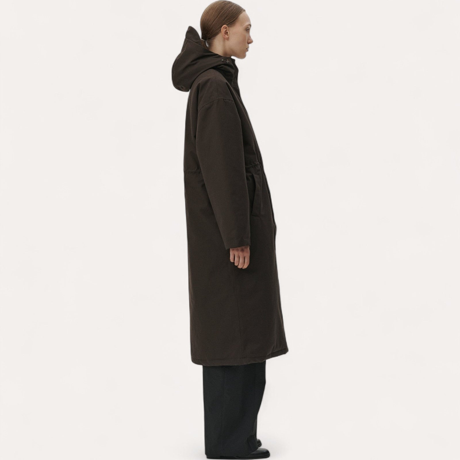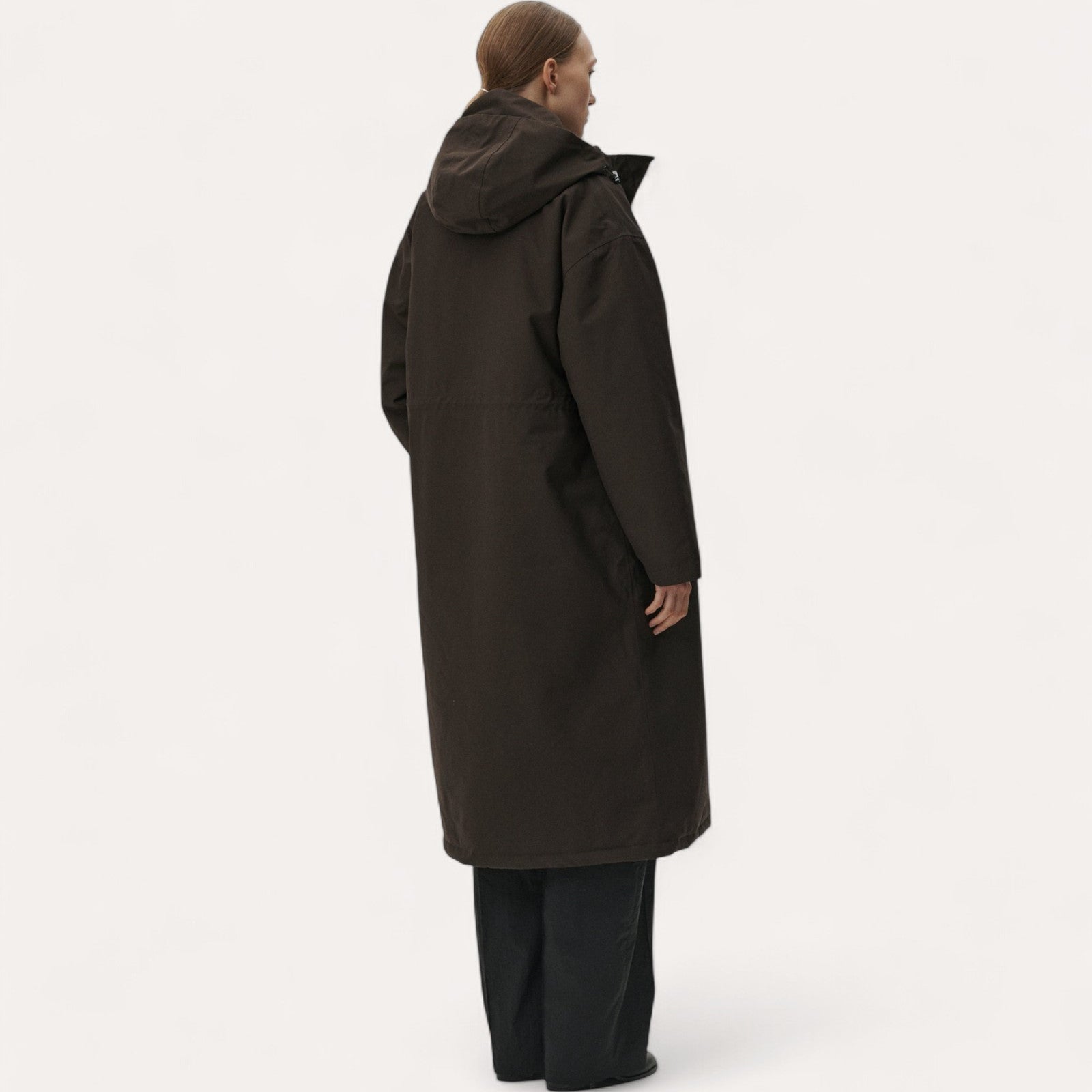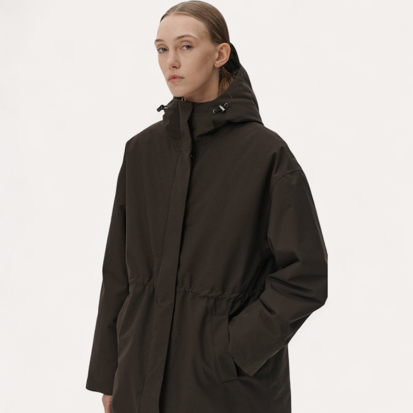 Coupe Décontractée : Silhouette ample (Roomy) avec des épaules tombantes et une taille ajustable par un cordon ciré.