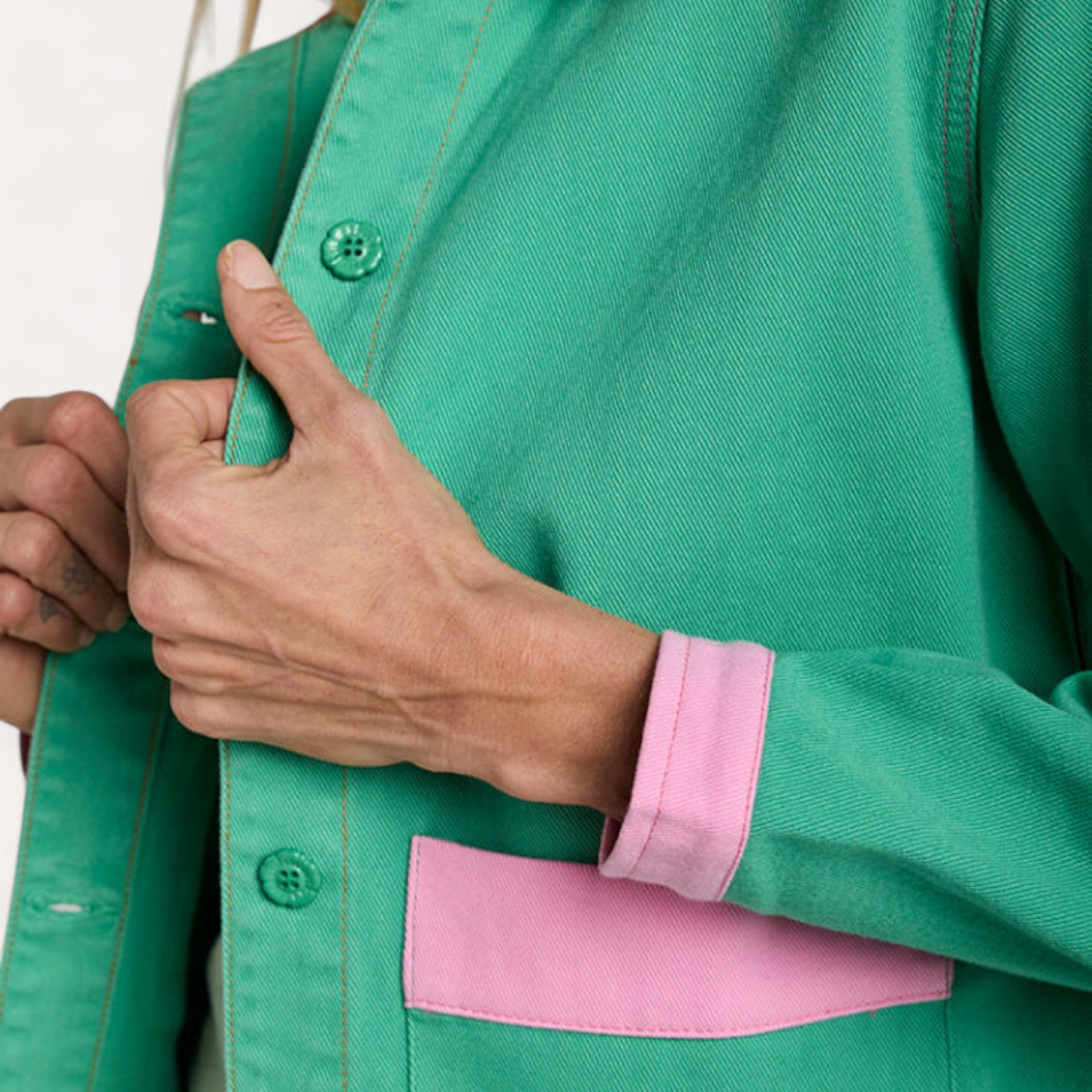 Veste sergé Graine 100% coton organique. Boutonnage central & boutons en corozo. Couleur vert avec surpiqûres multi. Deux poches plaquées latérales avec rabat rose. Col classique orange. Bas de manche rose.