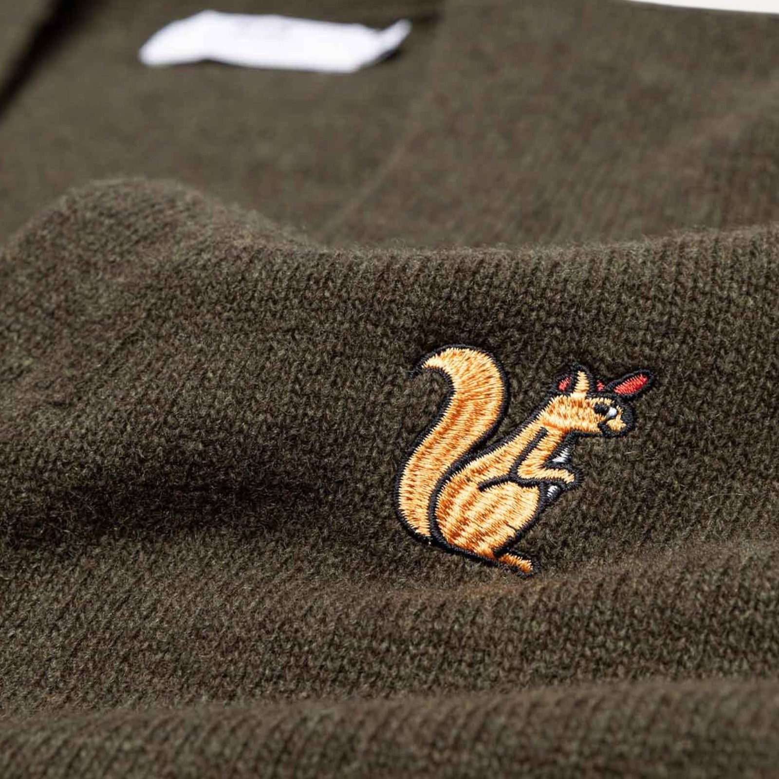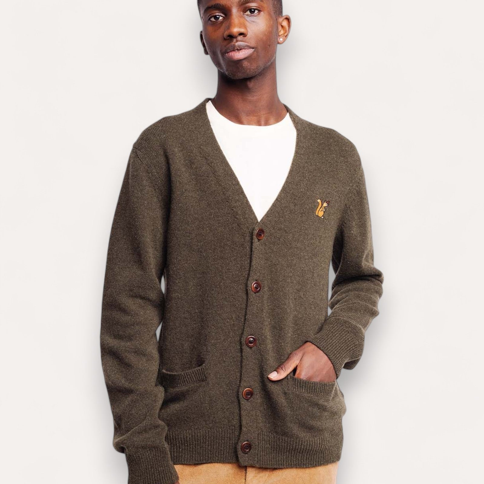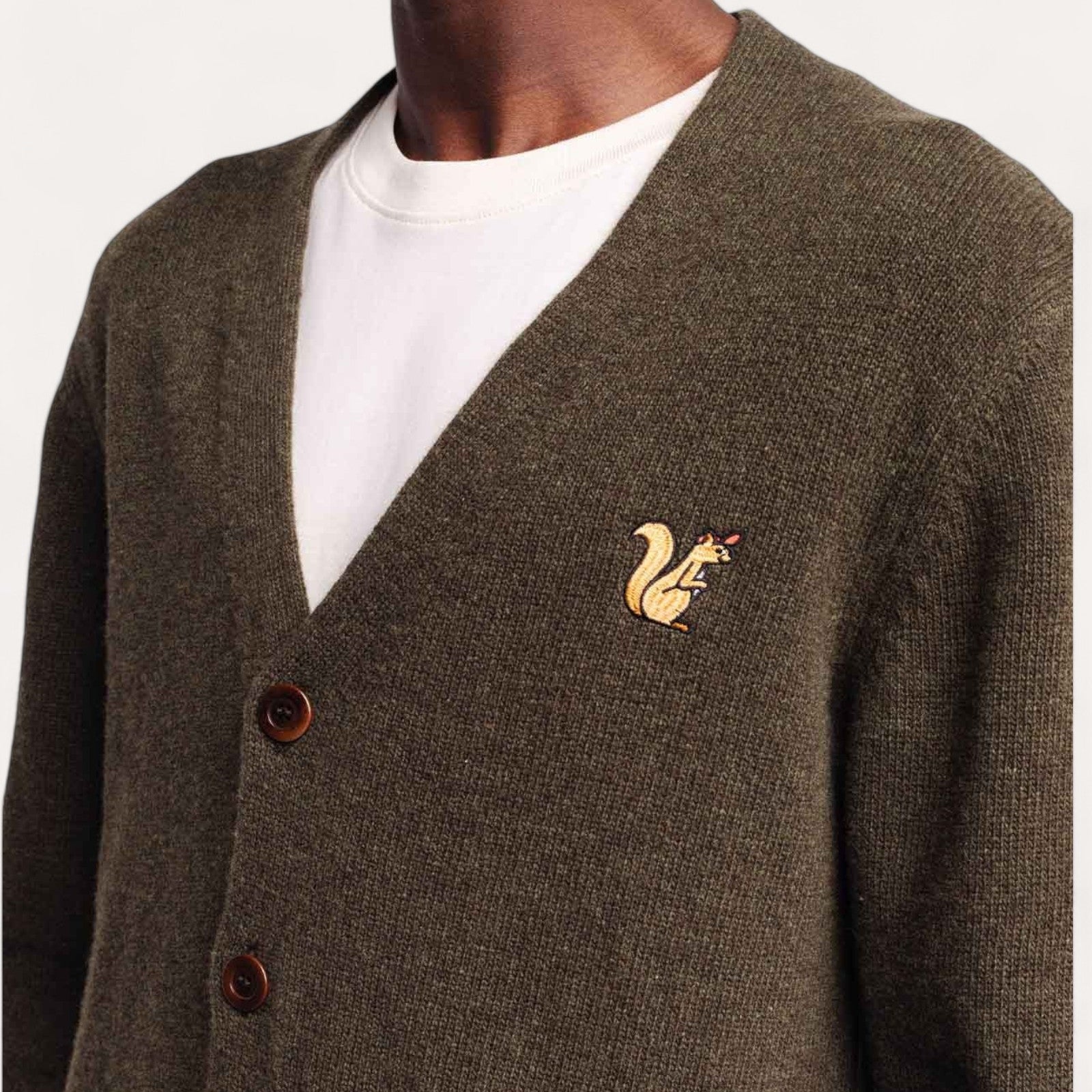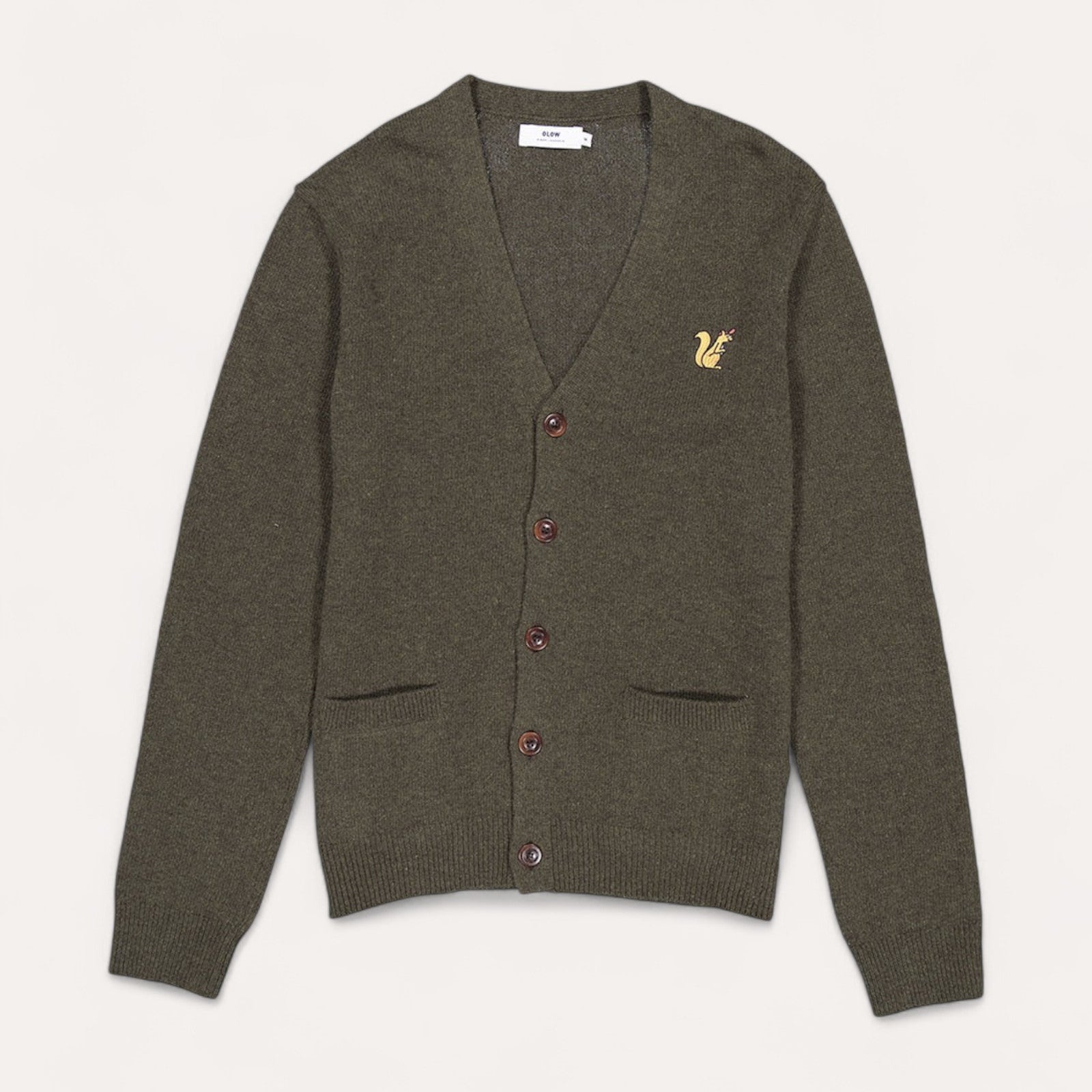 Cardigan Olow 100% laine. Broderie sur le cœur, coupe légèrement ample. Boutons en corozo, poches passepoils, col en V. Couleur kaki.