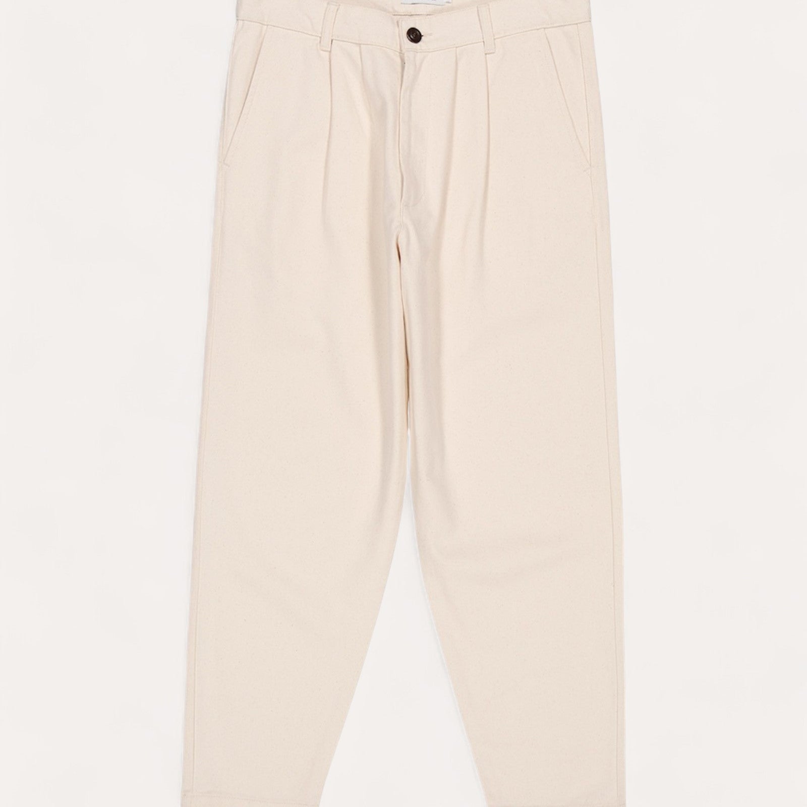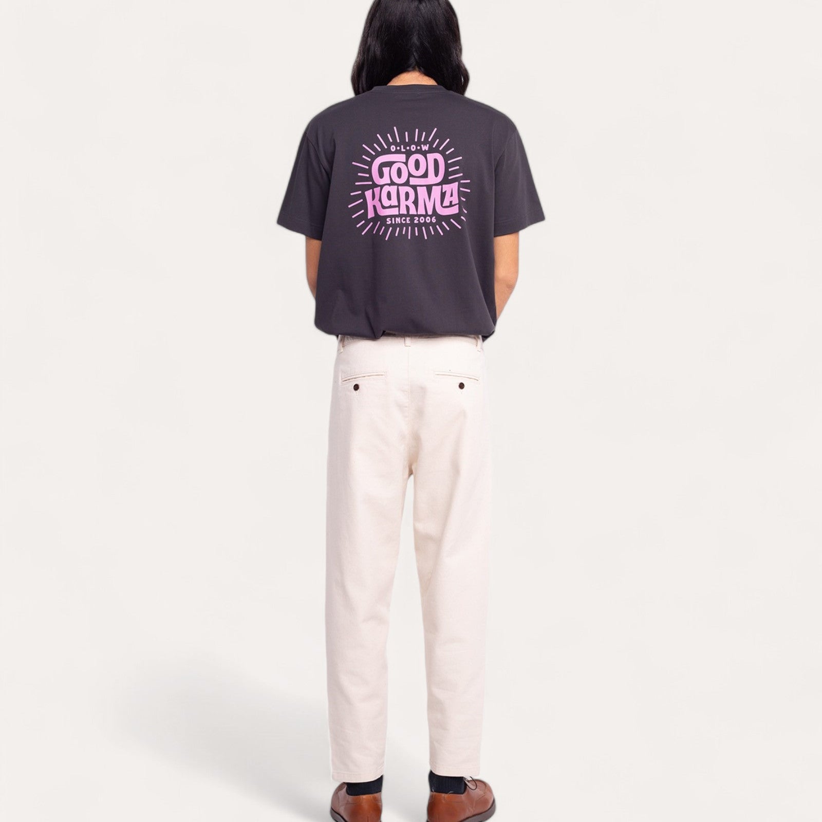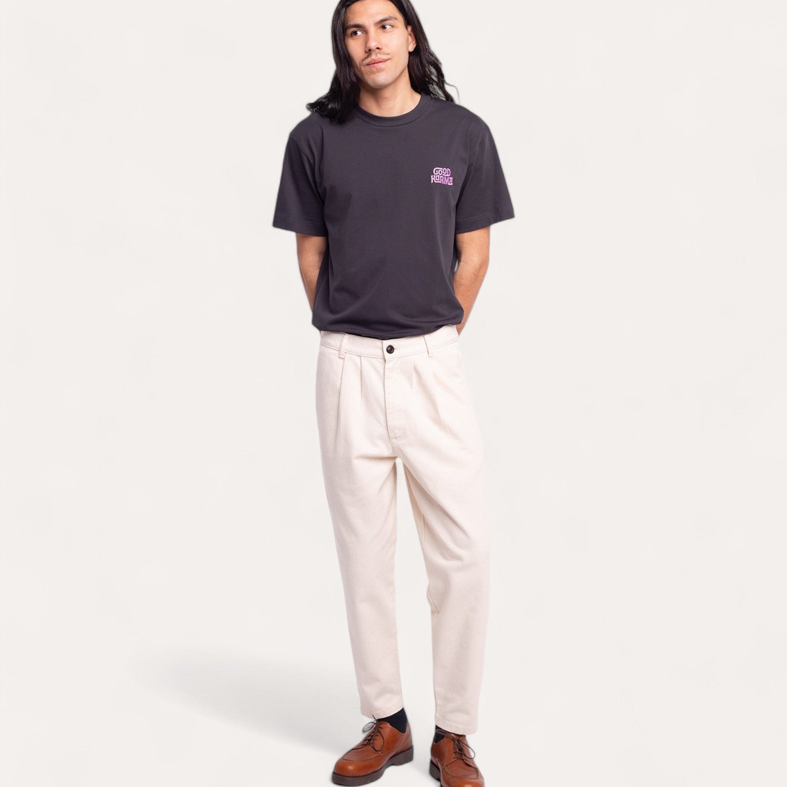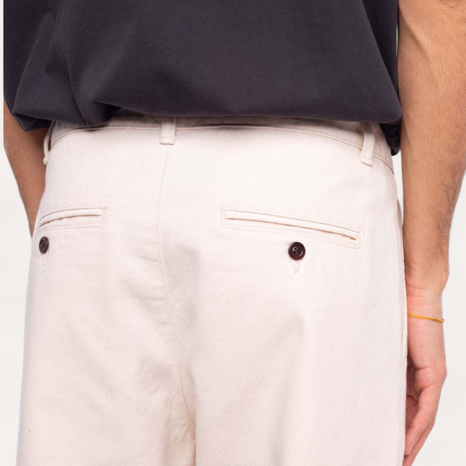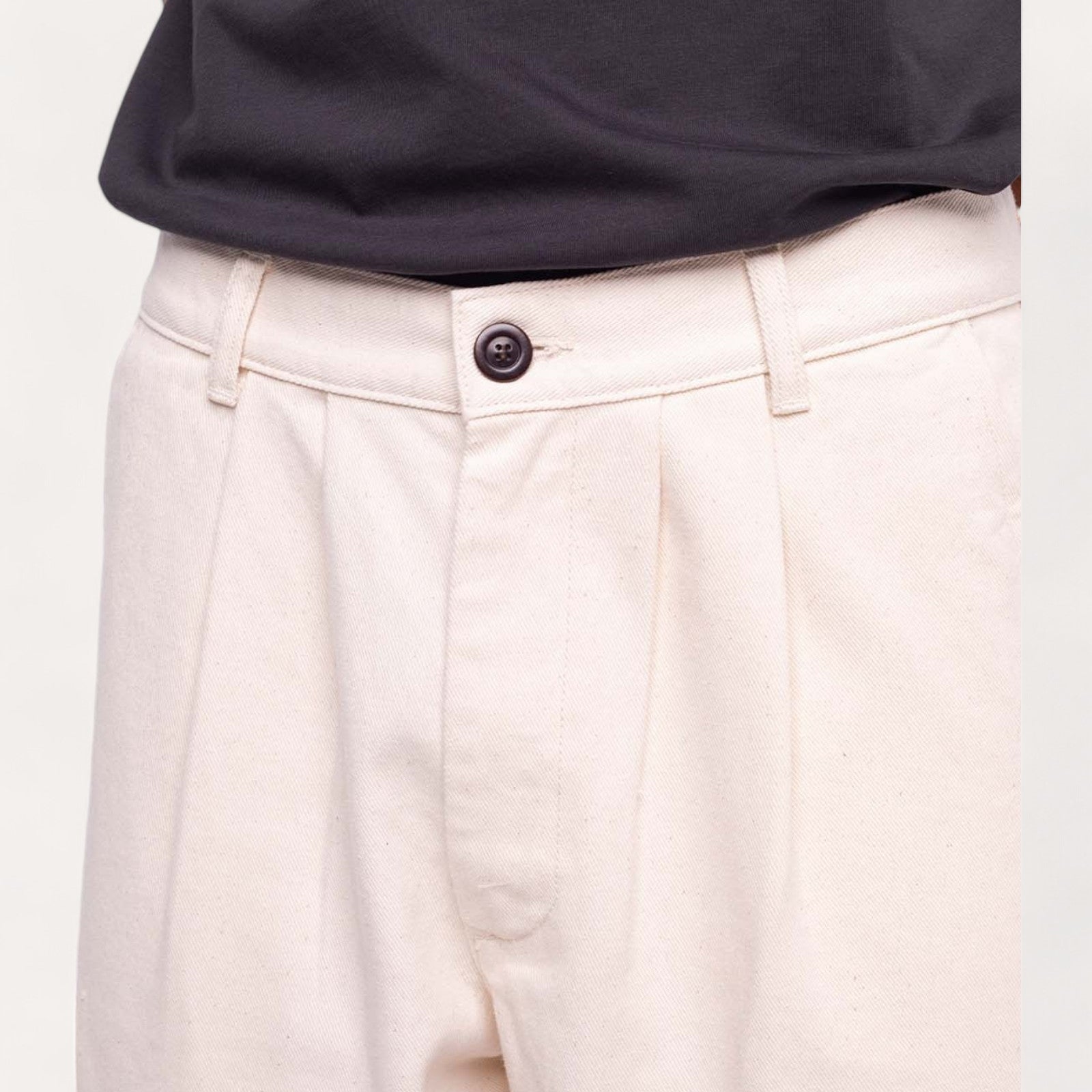 Pantalon Olow Swing. Toile denim 100% coton bio 380g. Coupe fuselée (confort sur le haut, resserré à la cheville) double plis. Poches latérales italiennes et deux poches arrières passepoilées. Boutons en corozo.