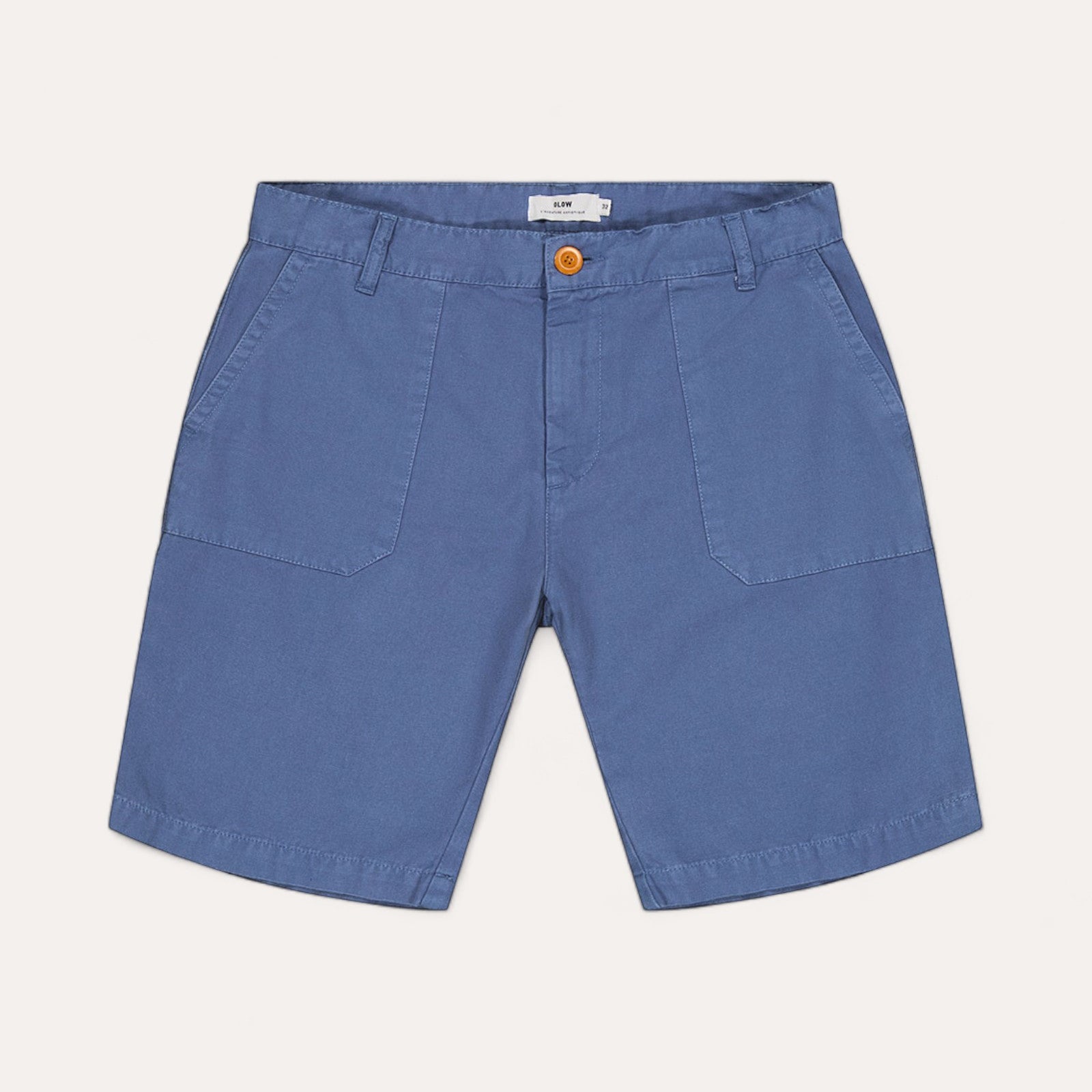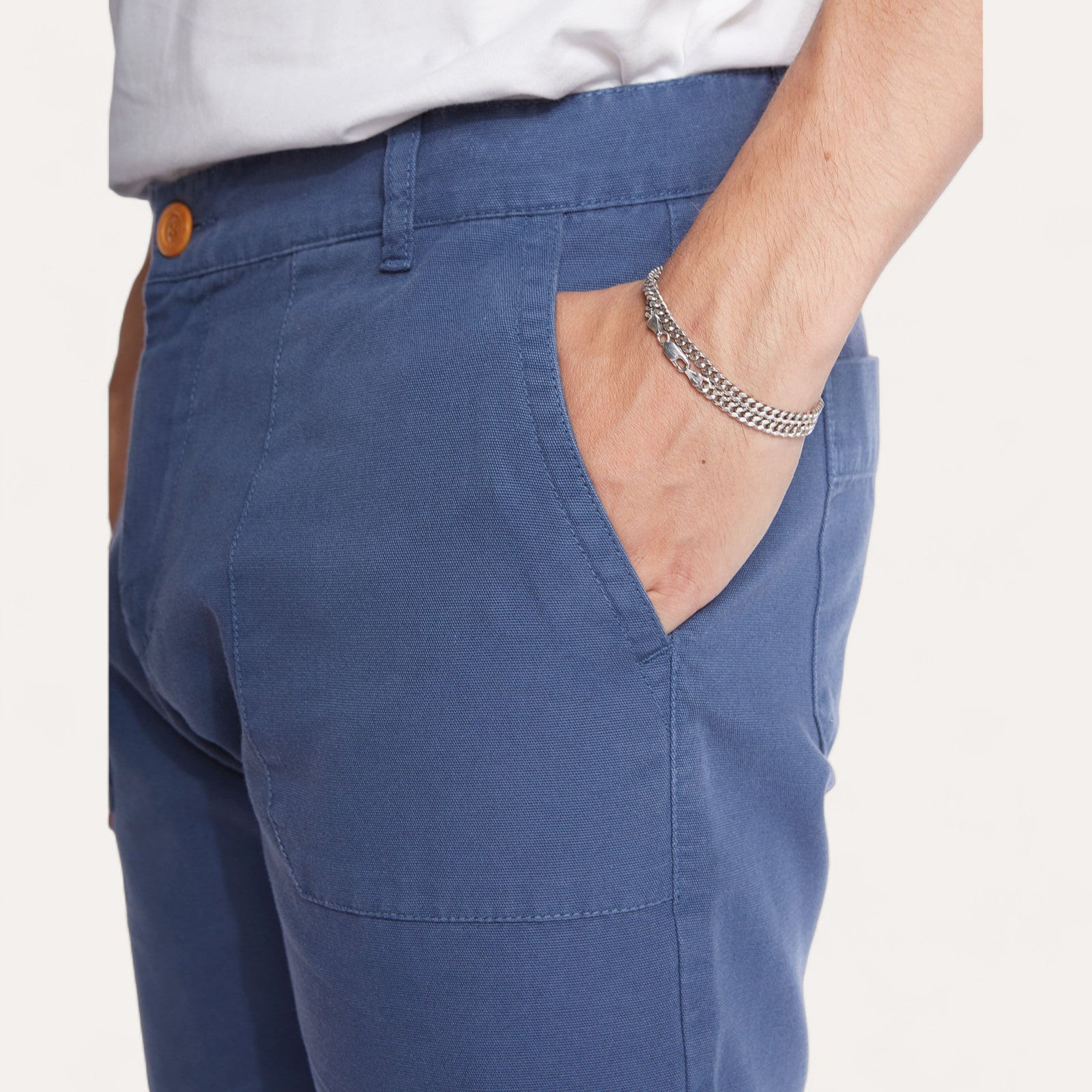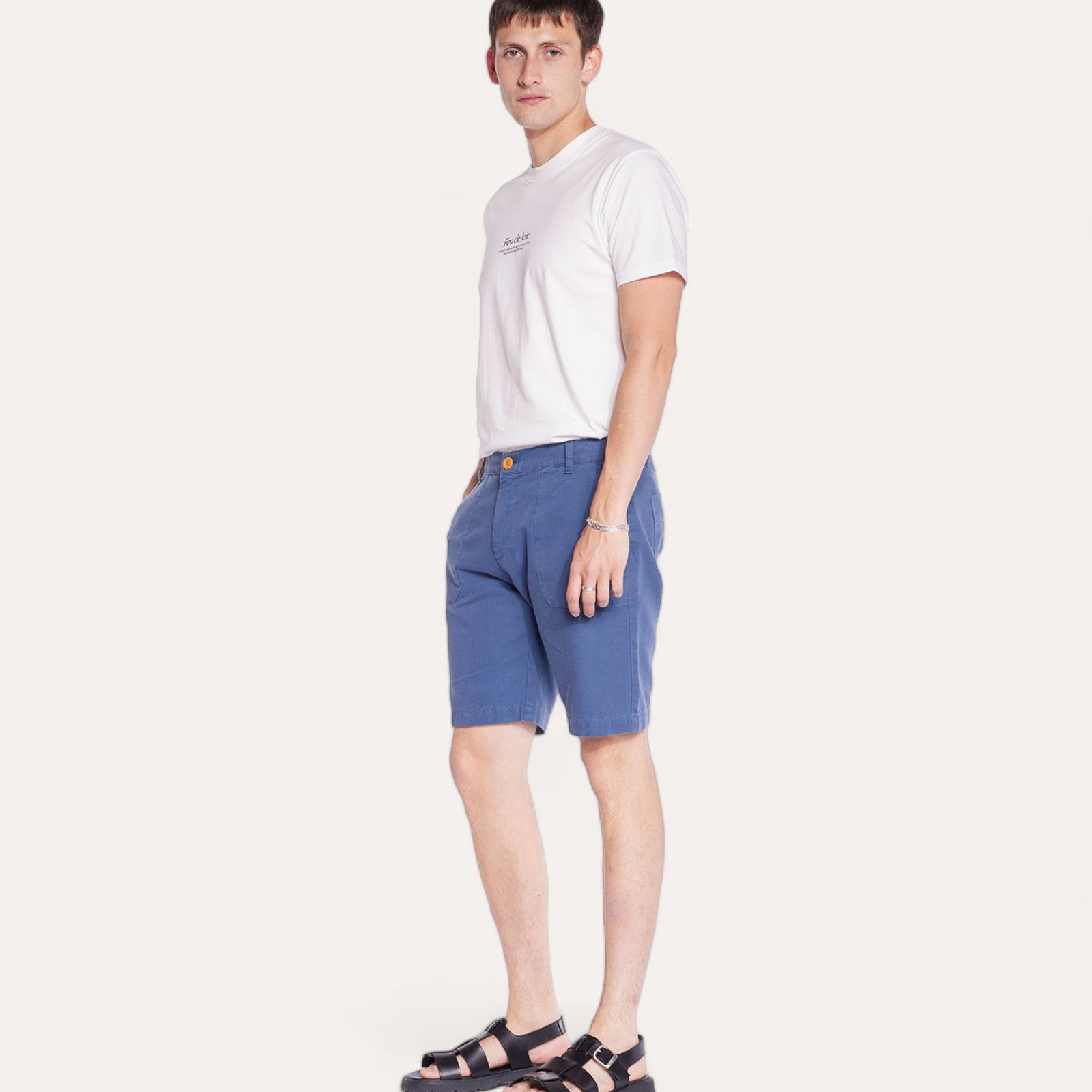 Short bleu cobalt en canvas coton biologique. Poches latérales plaquées, bouton en corozo naturel & zip YKK.