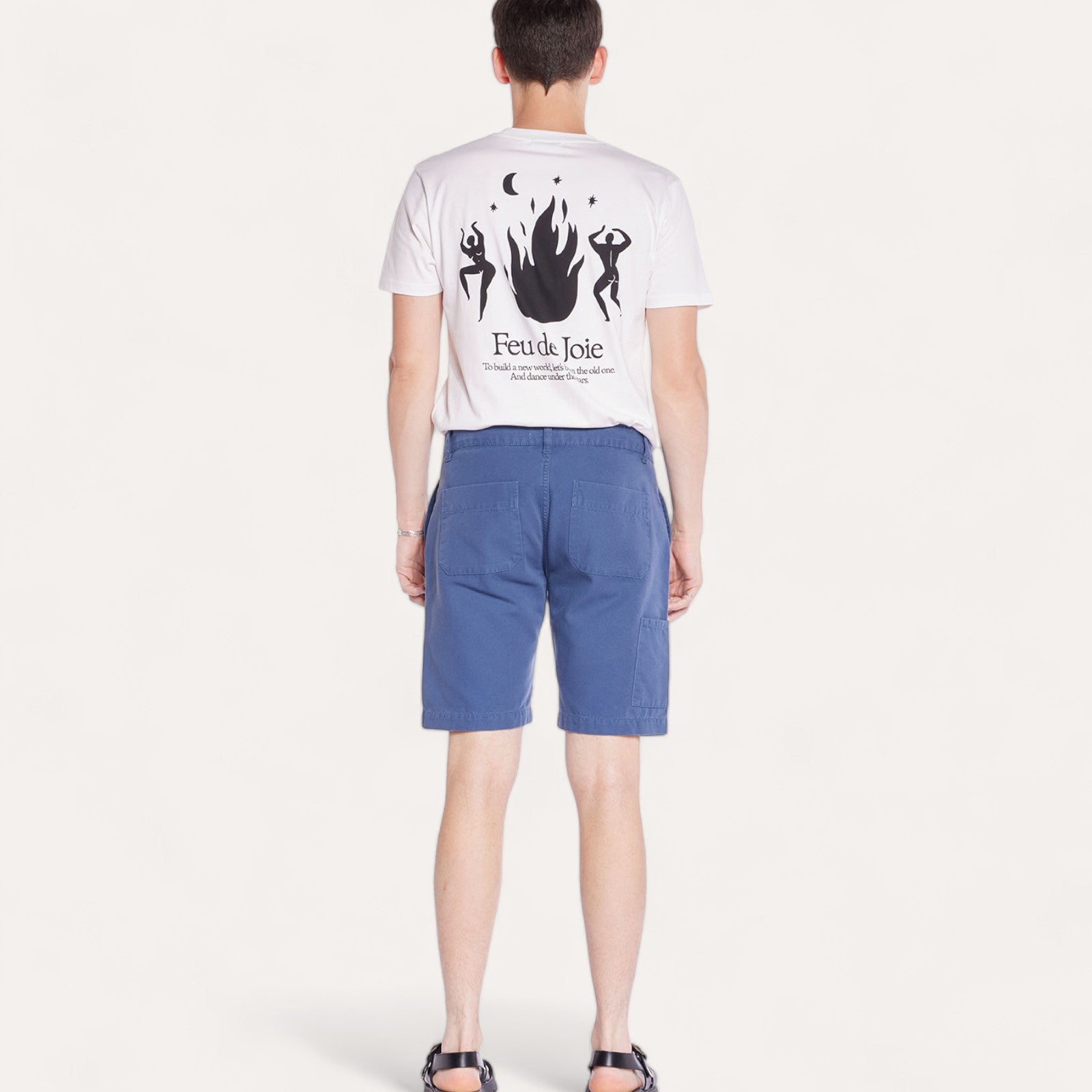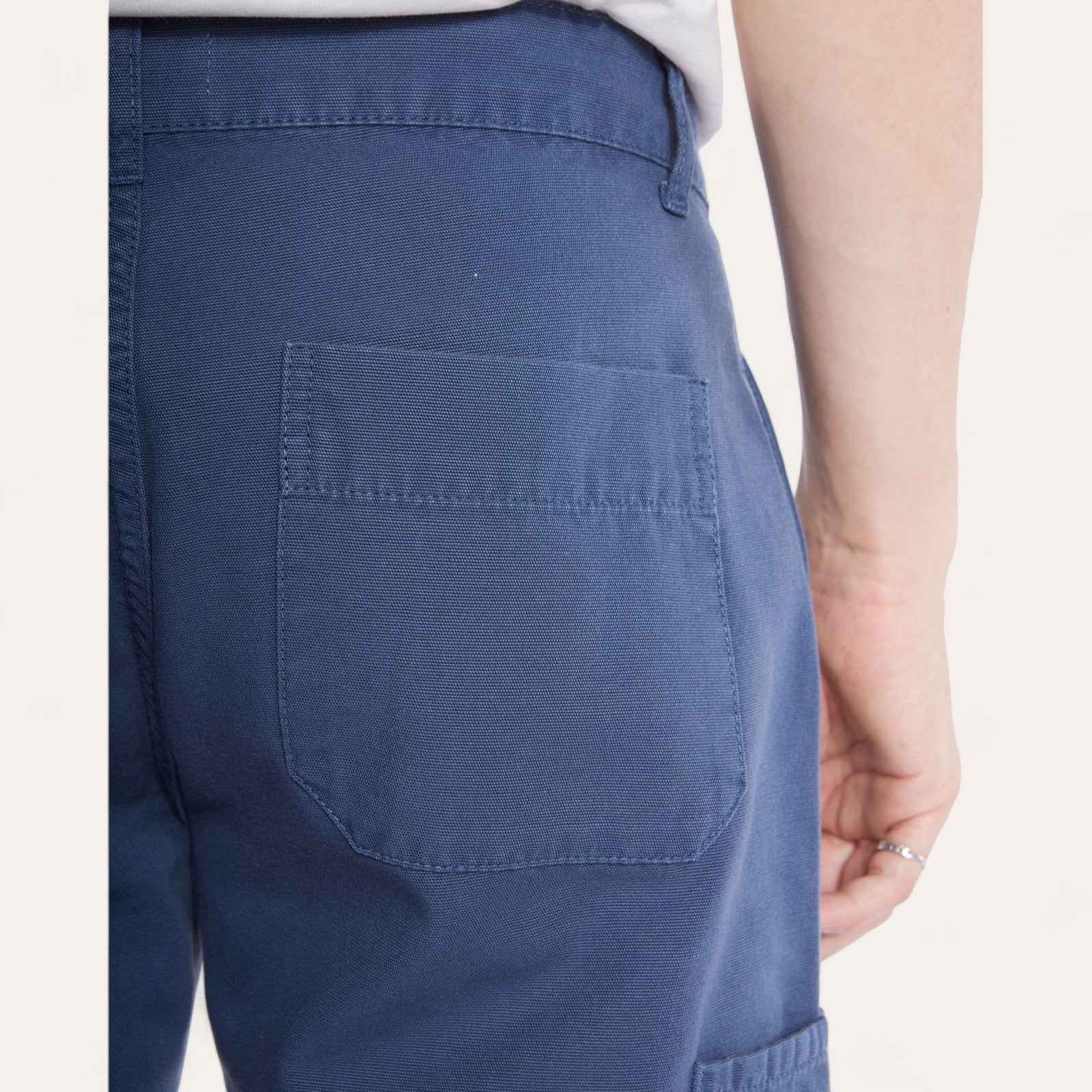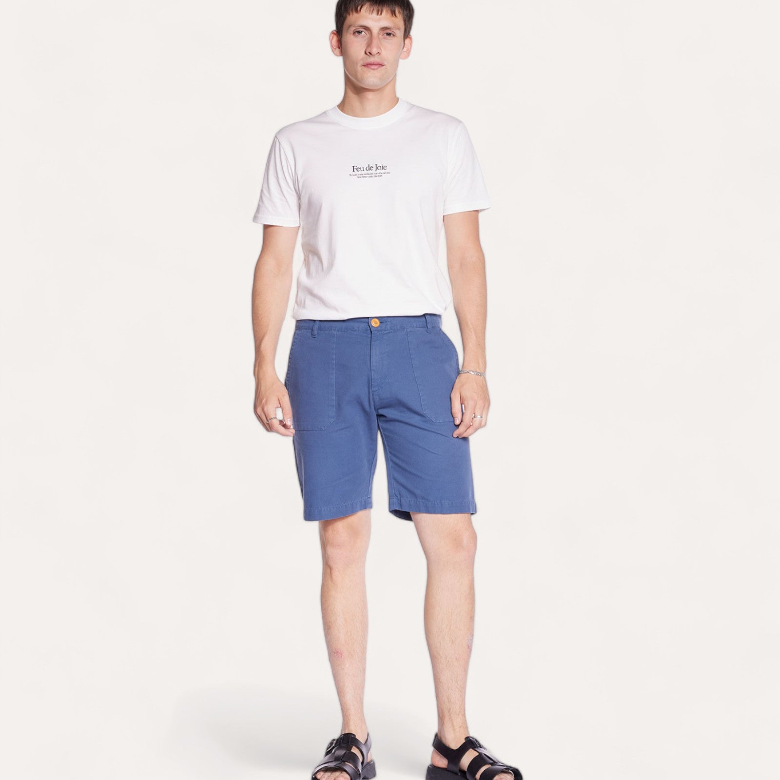 Short bleu cobalt en canvas coton biologique. Poches latérales plaquées, bouton en corozo naturel & zip YKK.