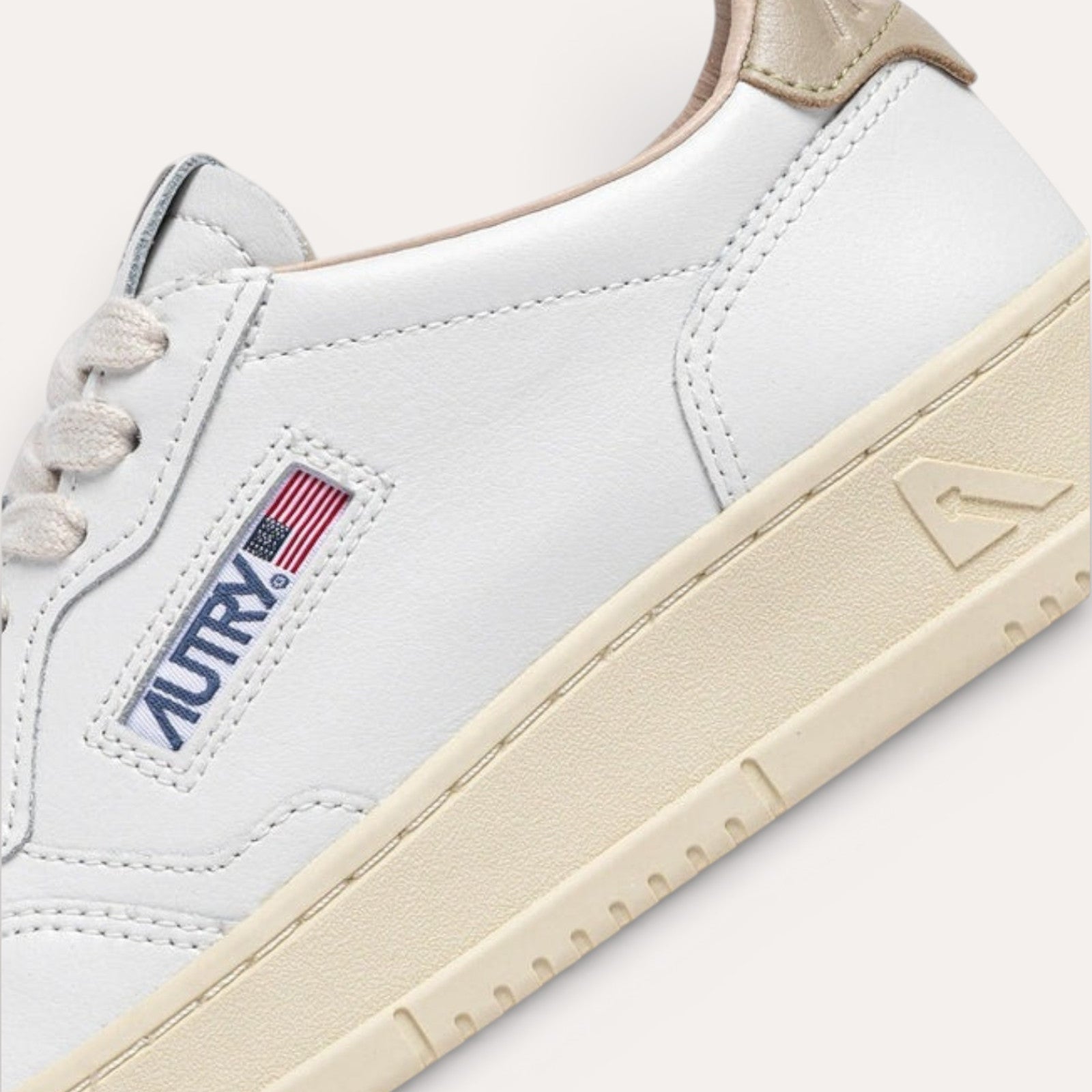 • Esthétique Bicolore : Sa tige en cuir blanc immaculé est rehaussée par un empiècement arrière Crème, offrant un contraste chic qui capte la lumière.