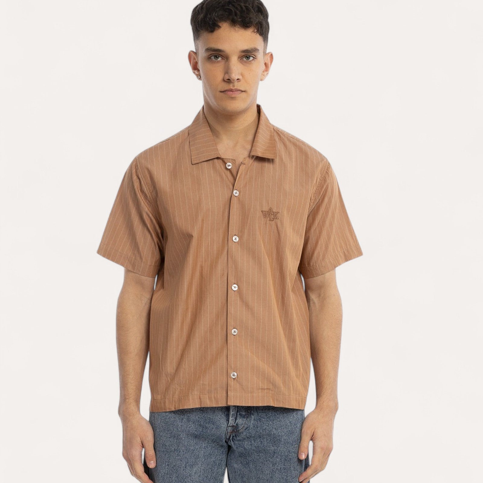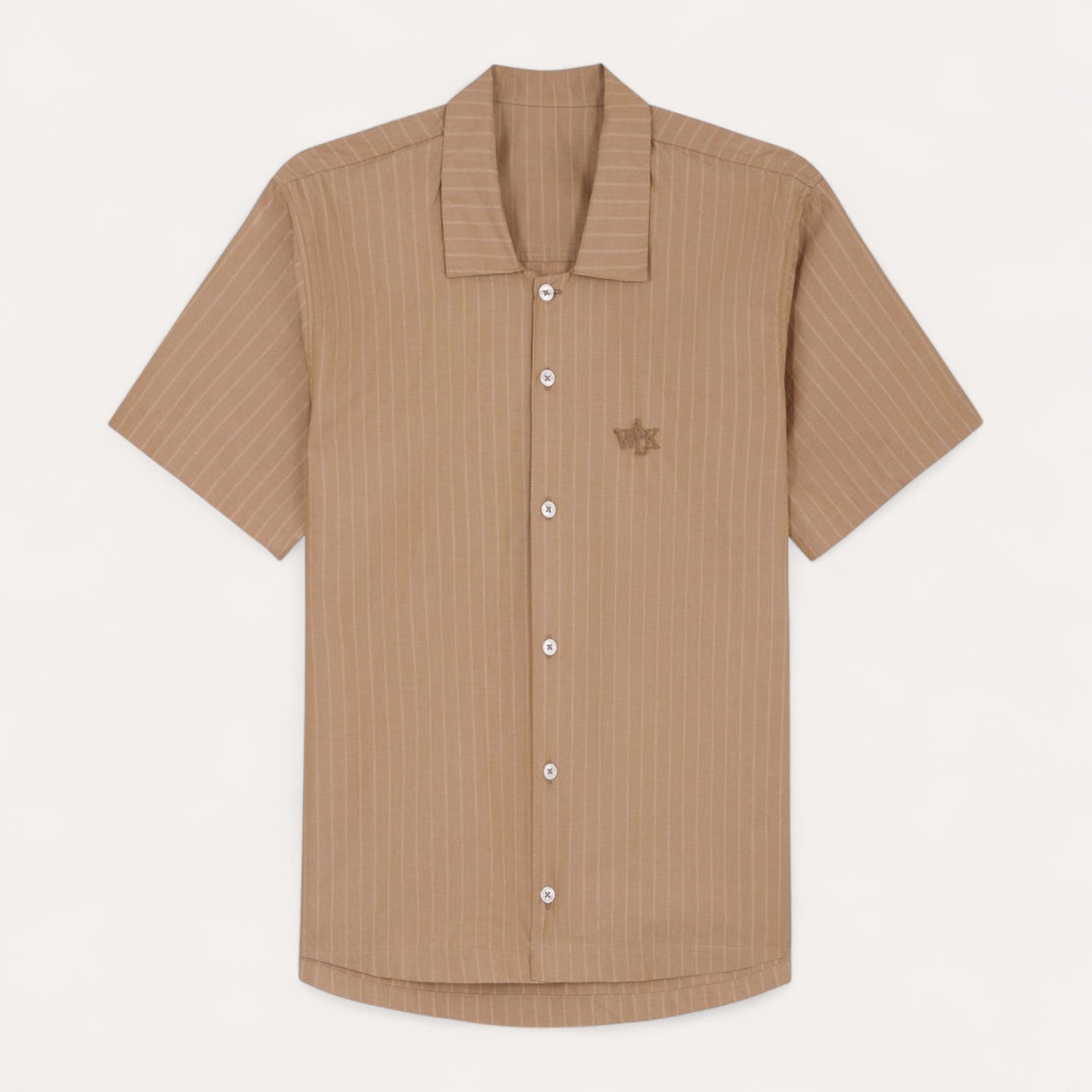 Chemise manches courtes marron en tissu fluide rayé et à la coupe droite.