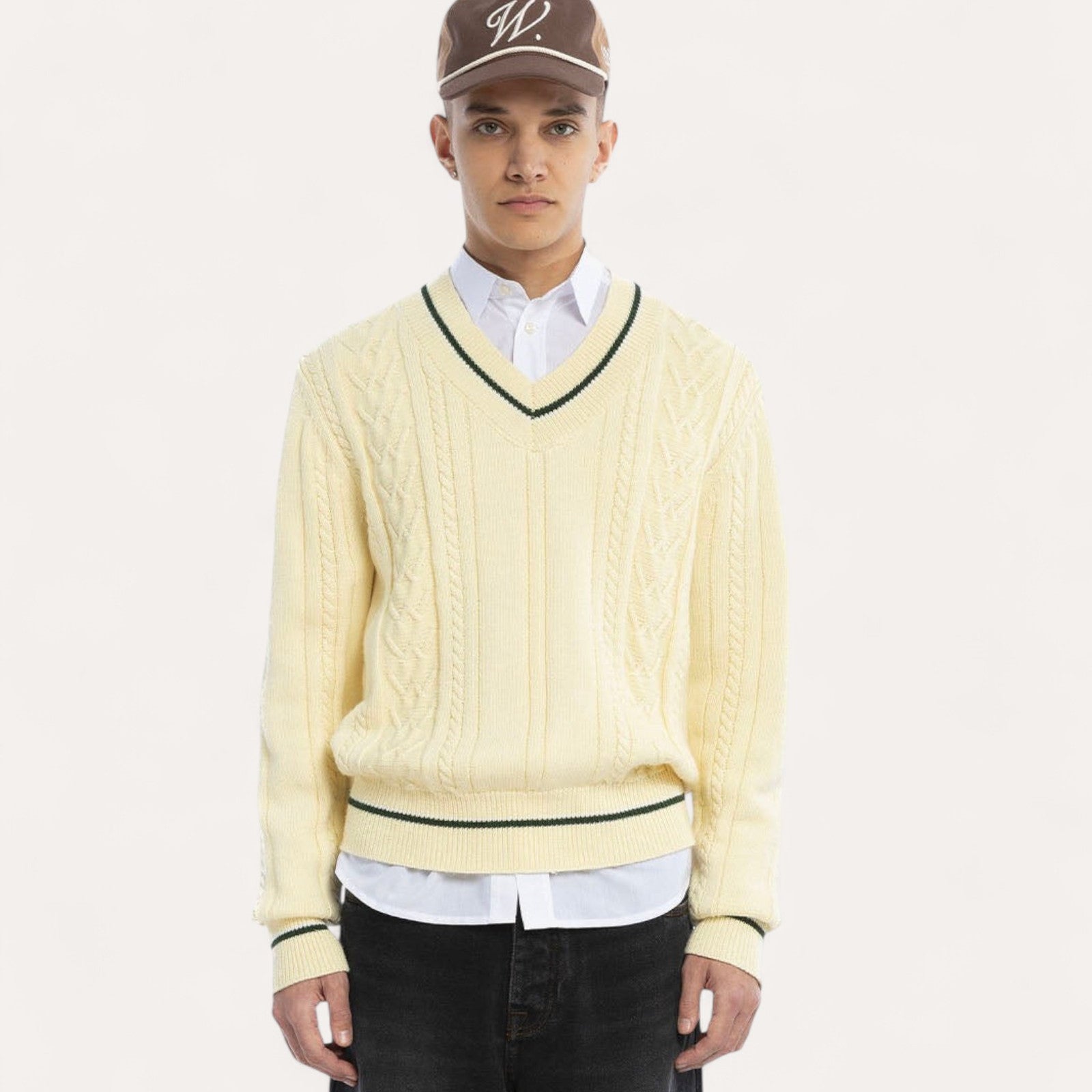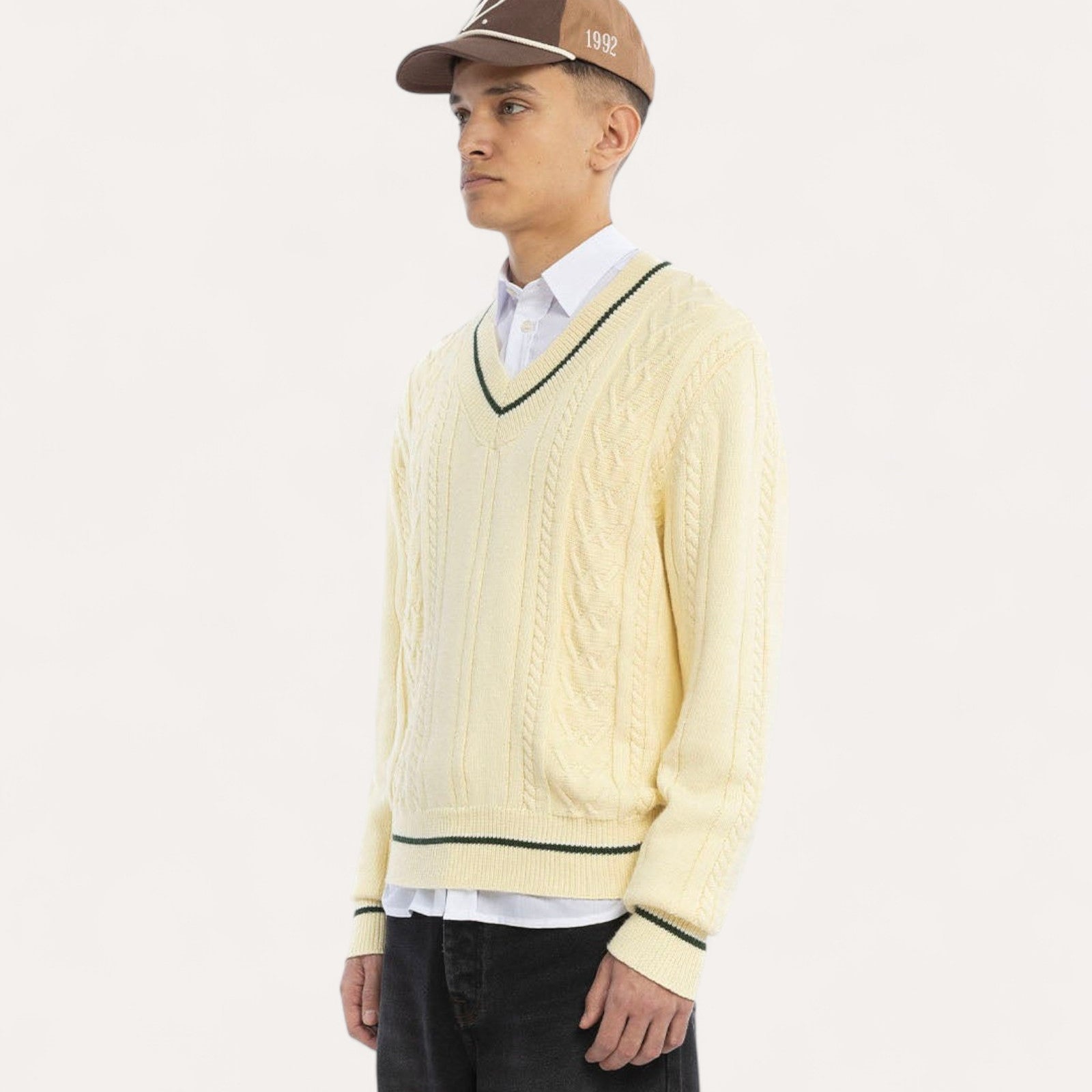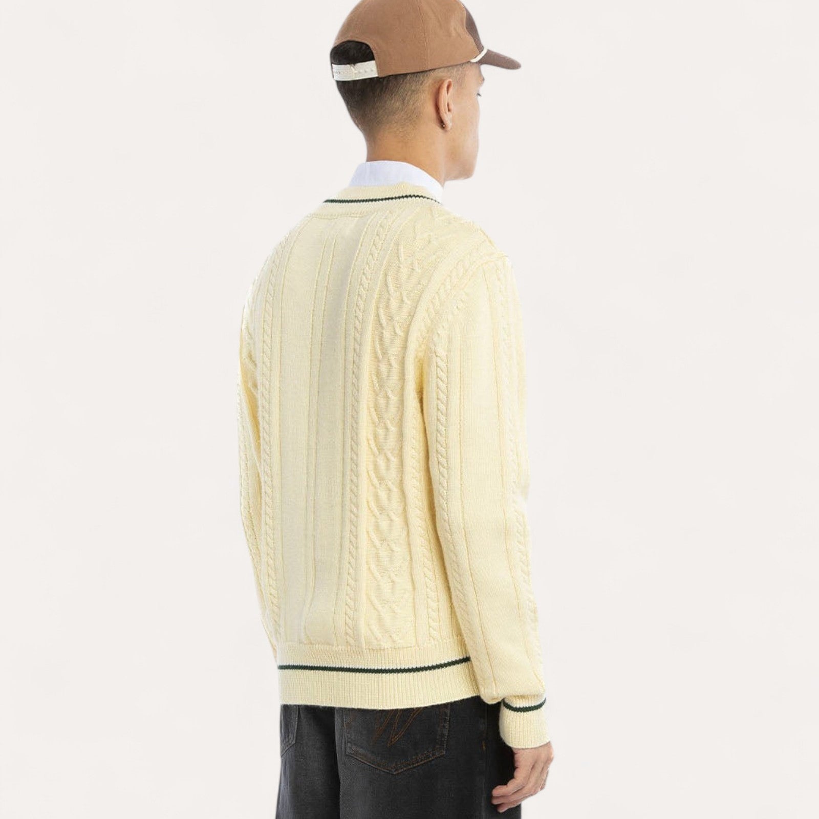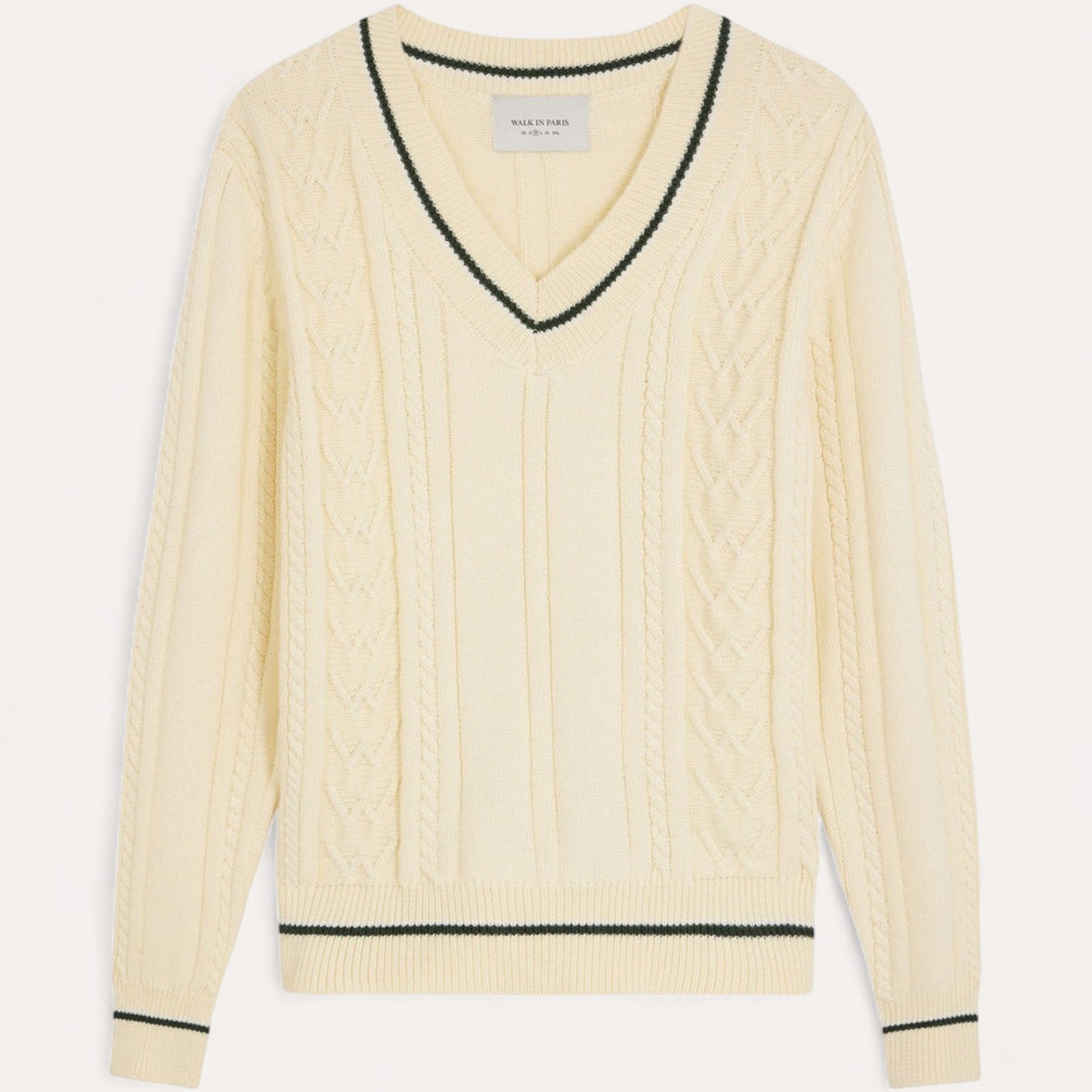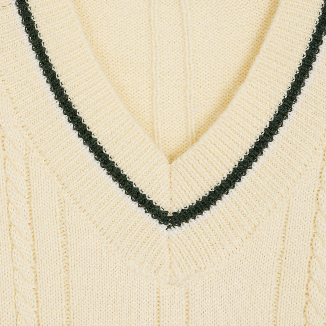 Détails : Maille torsadée en laine pour un relief sophistiqué et un col en V élégant.