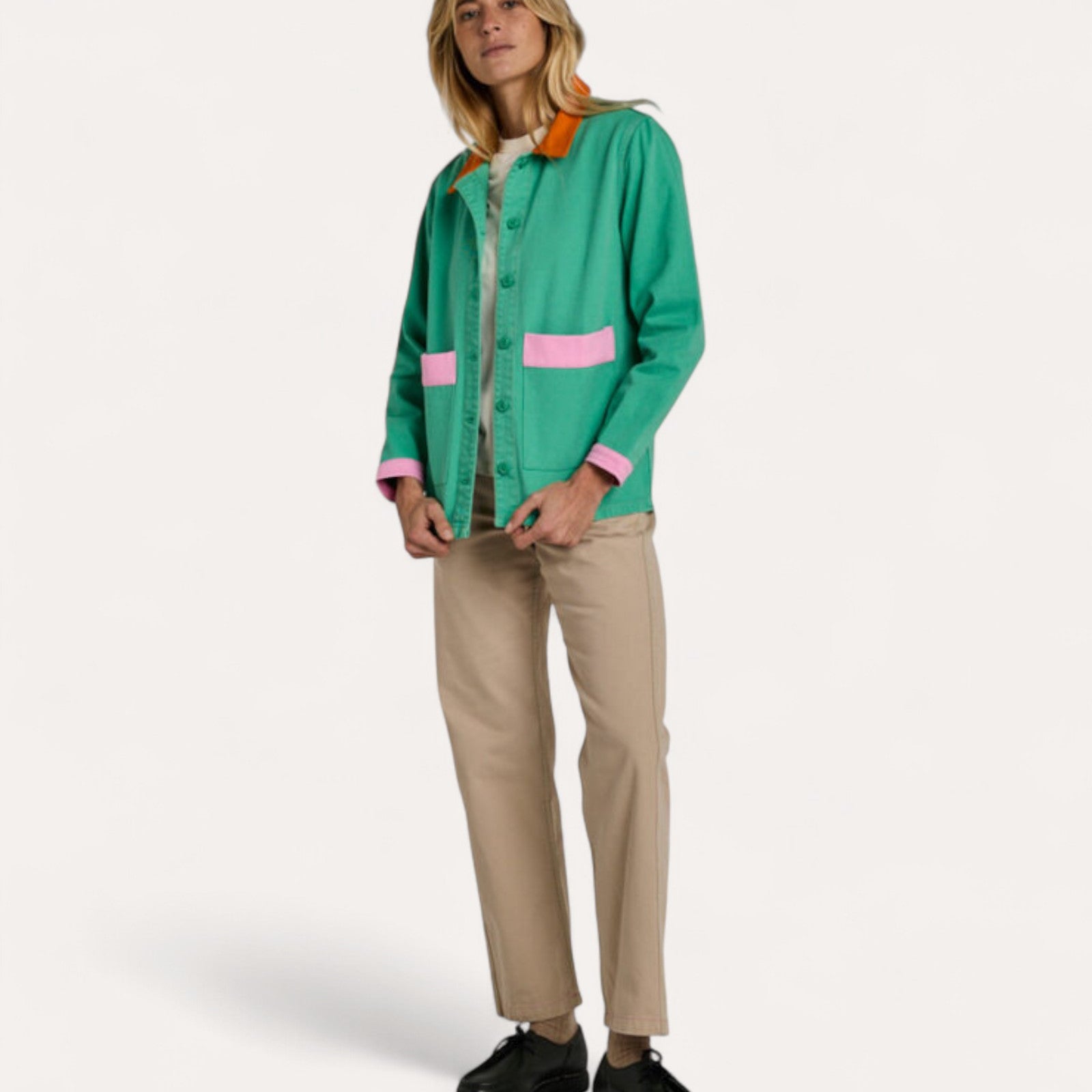 Veste sergé Graine 100% coton organique. Boutonnage central & boutons en corozo. Couleur vert avec surpiqûres multi. Deux poches plaquées latérales avec rabat rose. Col classique orange. Bas de manche rose.