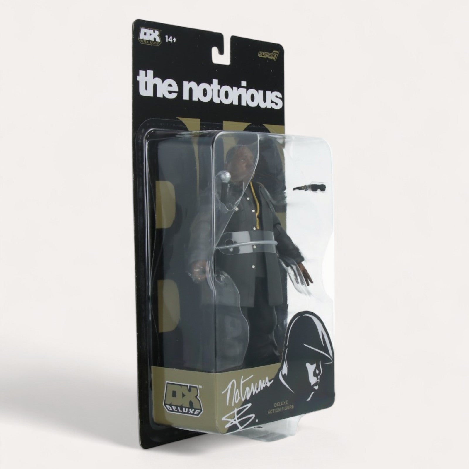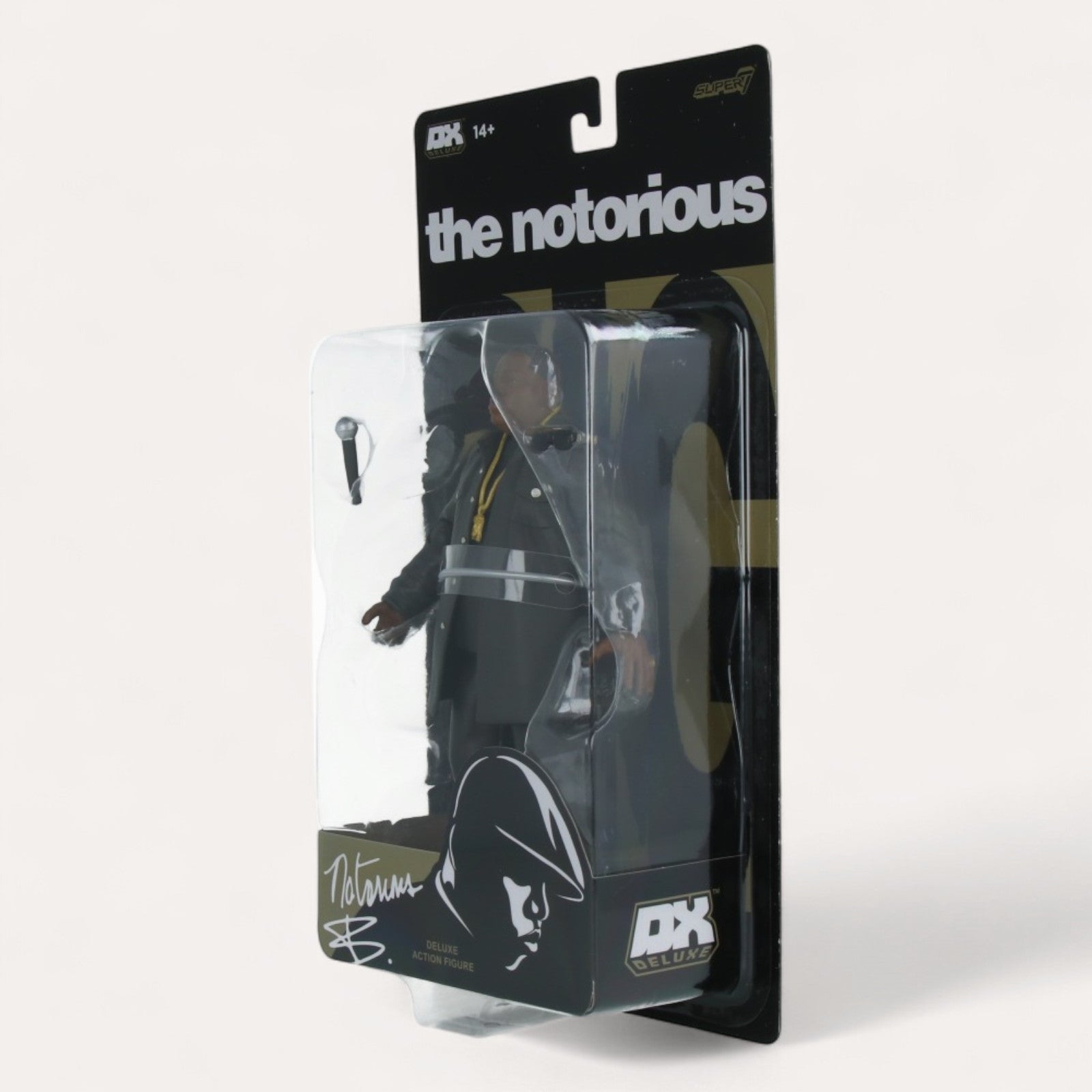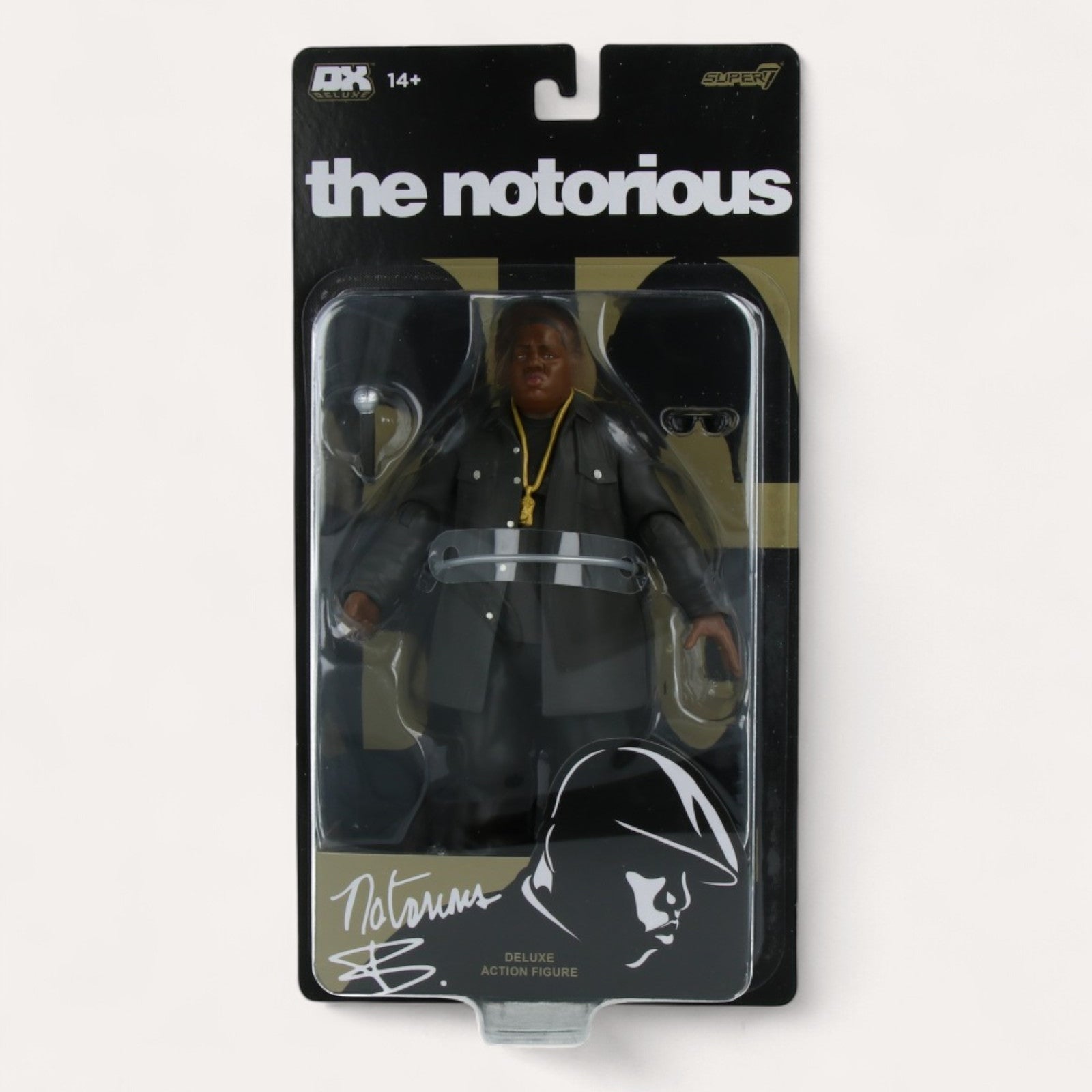 Biggie Figurine Deluxe (18cm). Capturez le charisme de Notorious B.I.G., légende du Hip-Hop. PVC noir. Accessoires : chaîne, micro, lunettes. Un essentiel pour collectionneur !