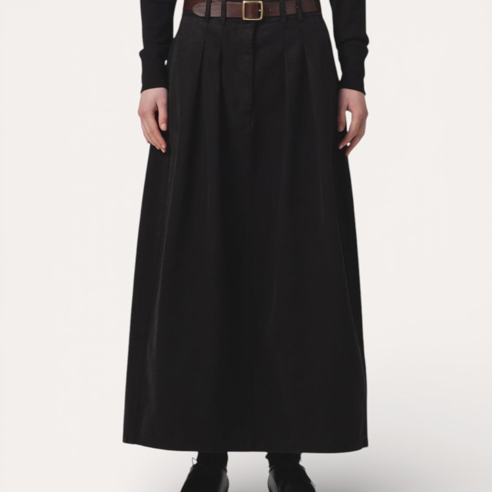 Coupe Droite et Plissée : Sa longueur midi est soulignée par un jeu de doubles plis qui apporte une tenue impeccable et une silhouette légèrement plus droite que les modèles classiques.