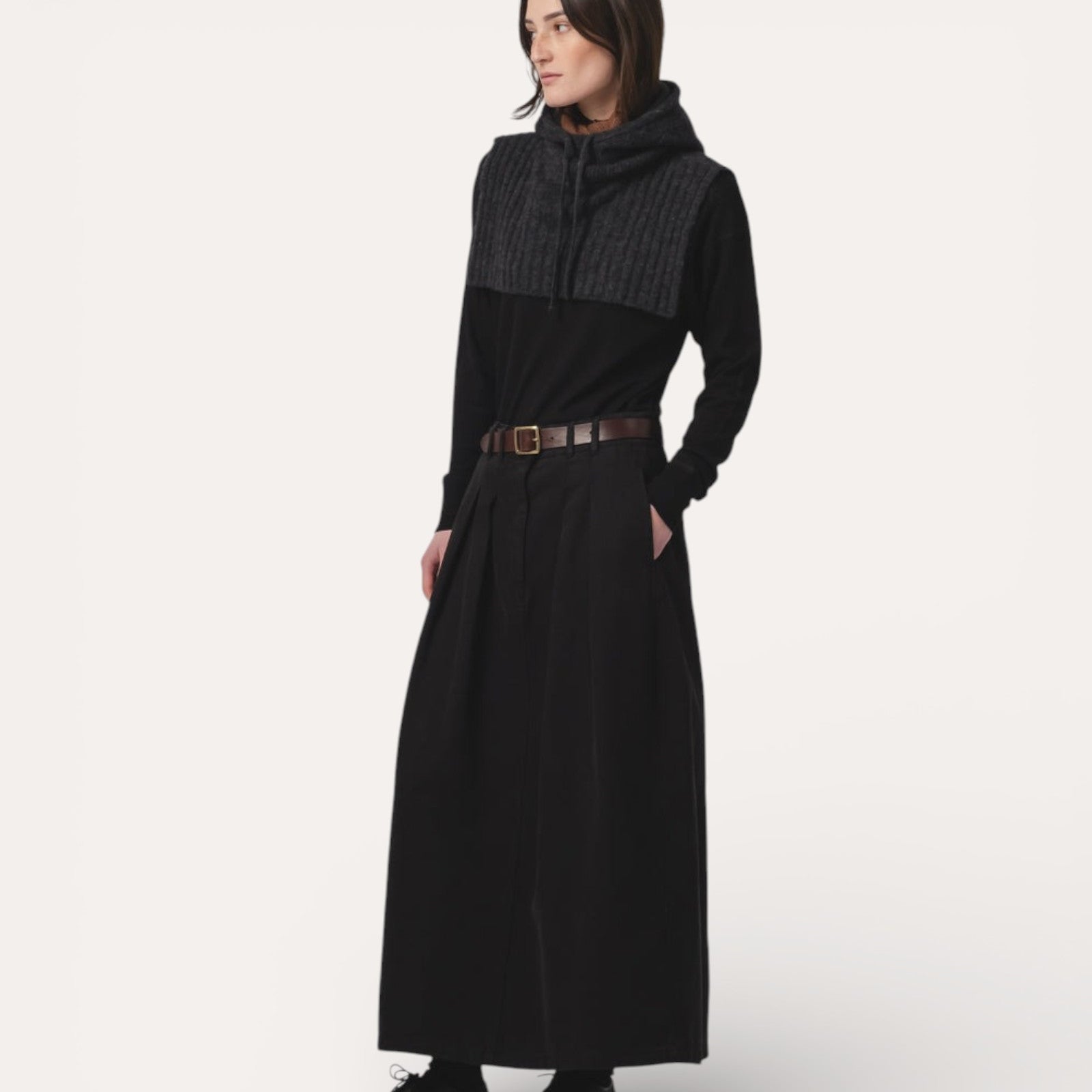 Détails Utilitaires : Véritable pièce de caractère, elle intègre deux poches avant et deux poches arrière, alliant parfaitement l'esthétique "workwear" à la féminité de la jupe.