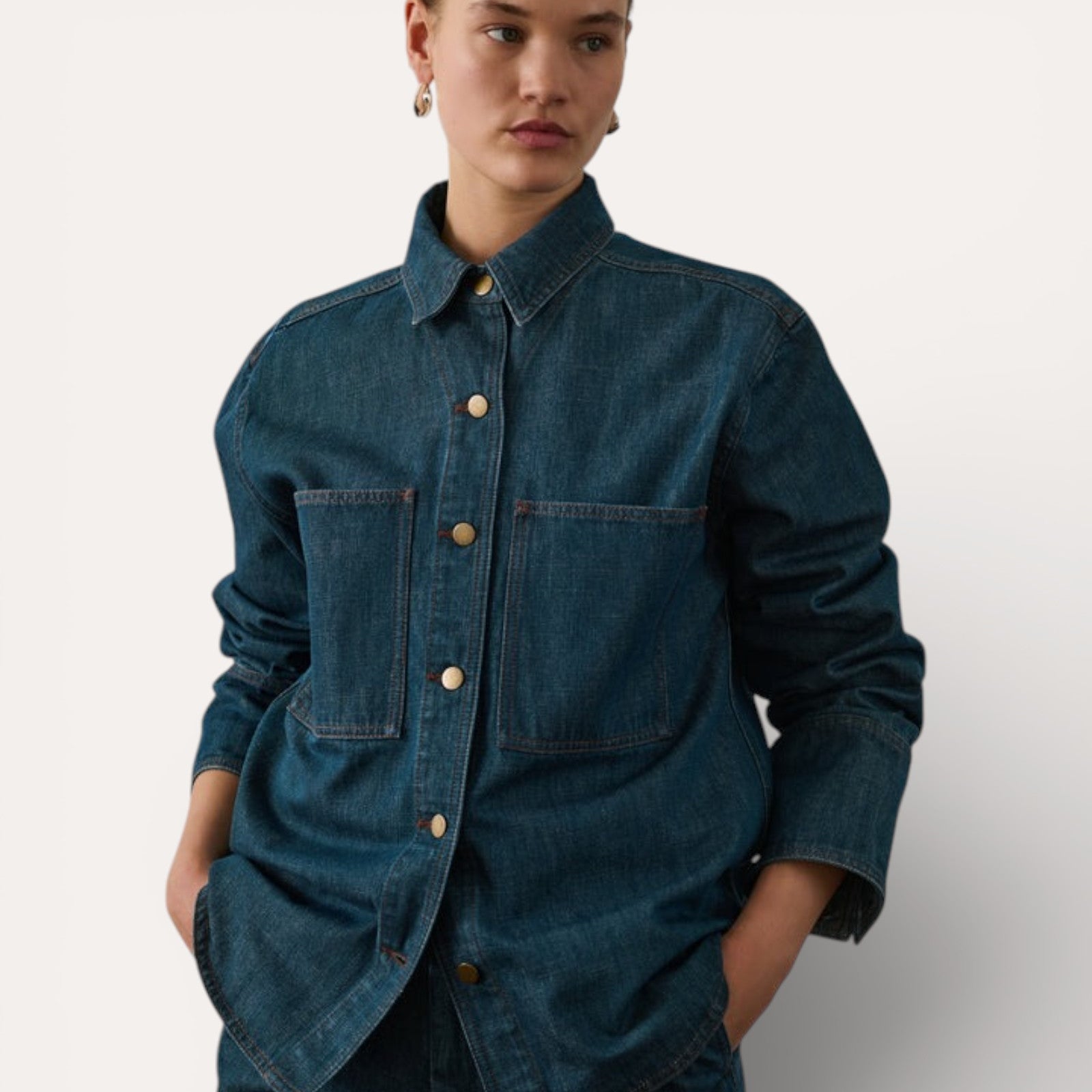 La chemise Garance en denim greencast propose un volume généreux et rétro. Son style workwear et sa matière régénérée en font une pièce forte du vestiaire moderne.