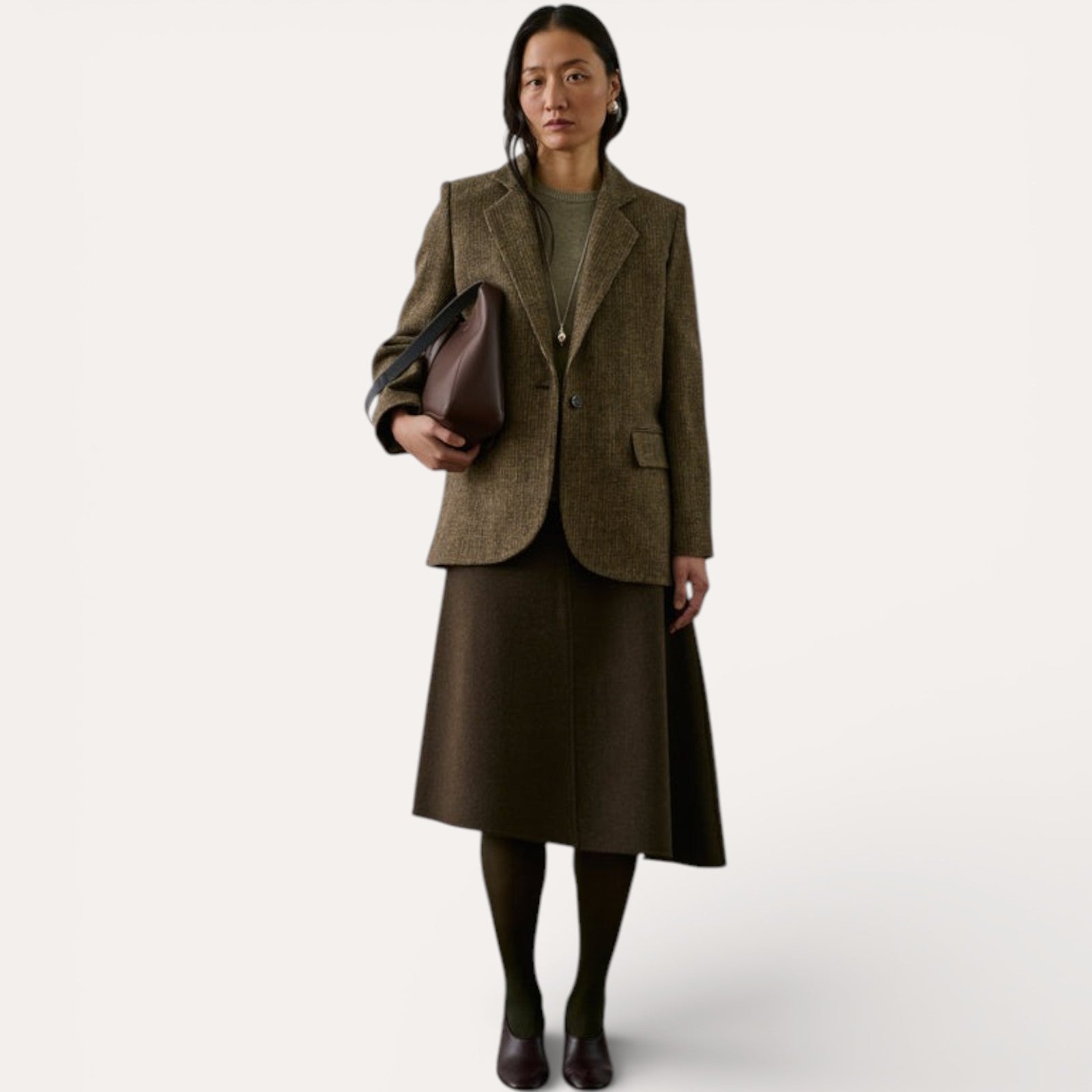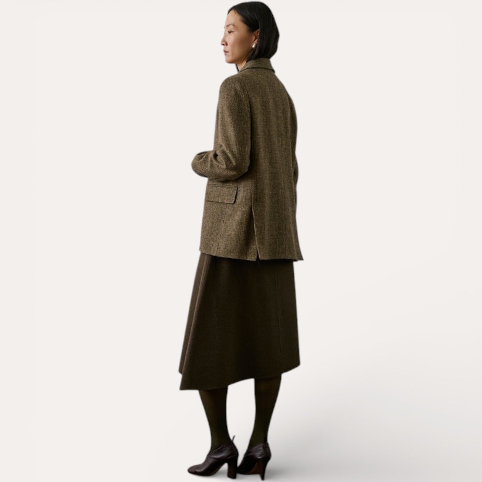 • Tweed de Laine Vierge : Confectionnée en 100% laine vierge, cette matière mouchetée marron et beige offre une texture riche, une excellente tenue et une chaleur naturelle.